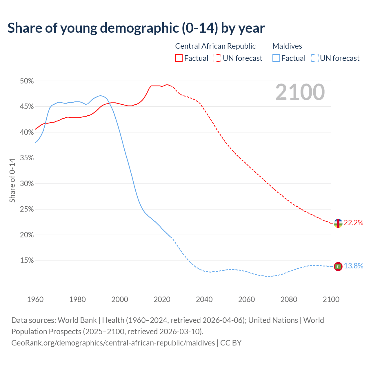 - The share of young demographic (0-15 years old) in the Central African Republic is 49% vs 19.6% in Maldives.