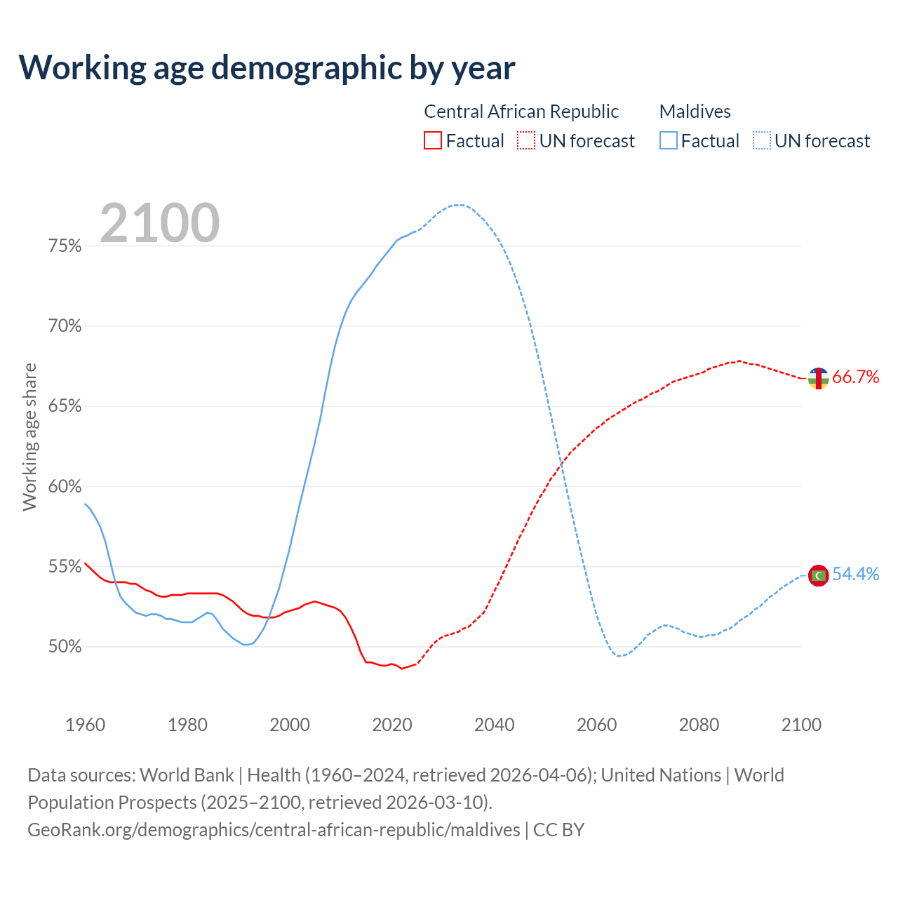 - The Central African Republic has 2.81M working age adults (aged 15-64) vs 403K in Maldives.
