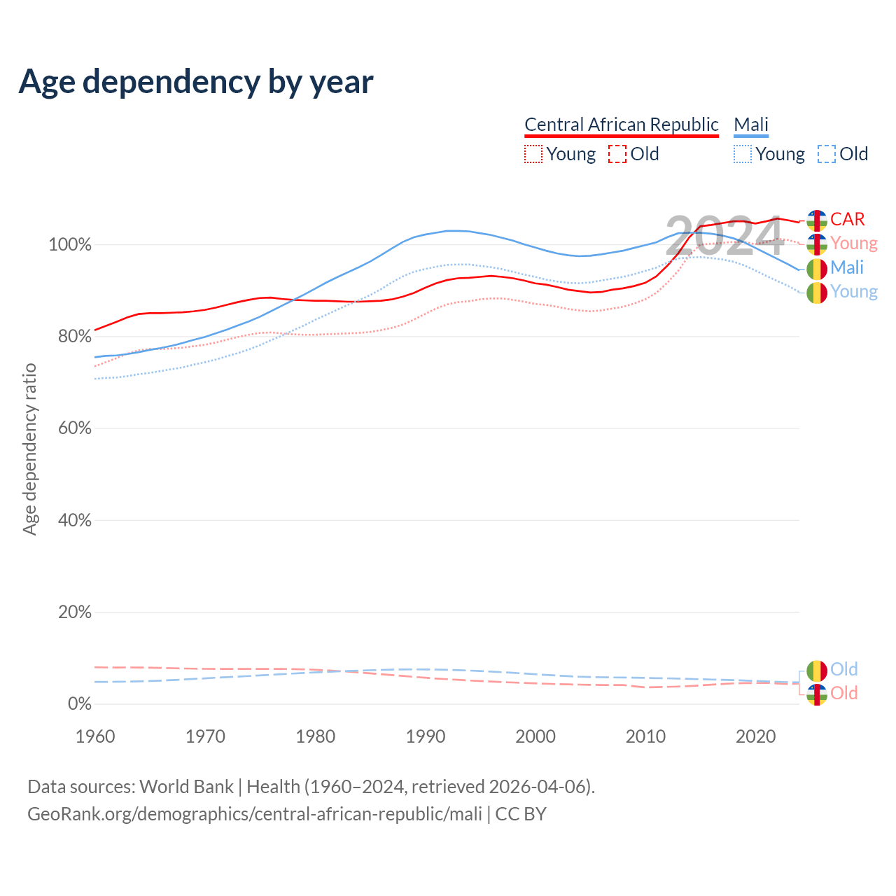 - The Central African Republic is ranked 196/196 by median age (oldest to youngest) vs 193/196 for Mali.