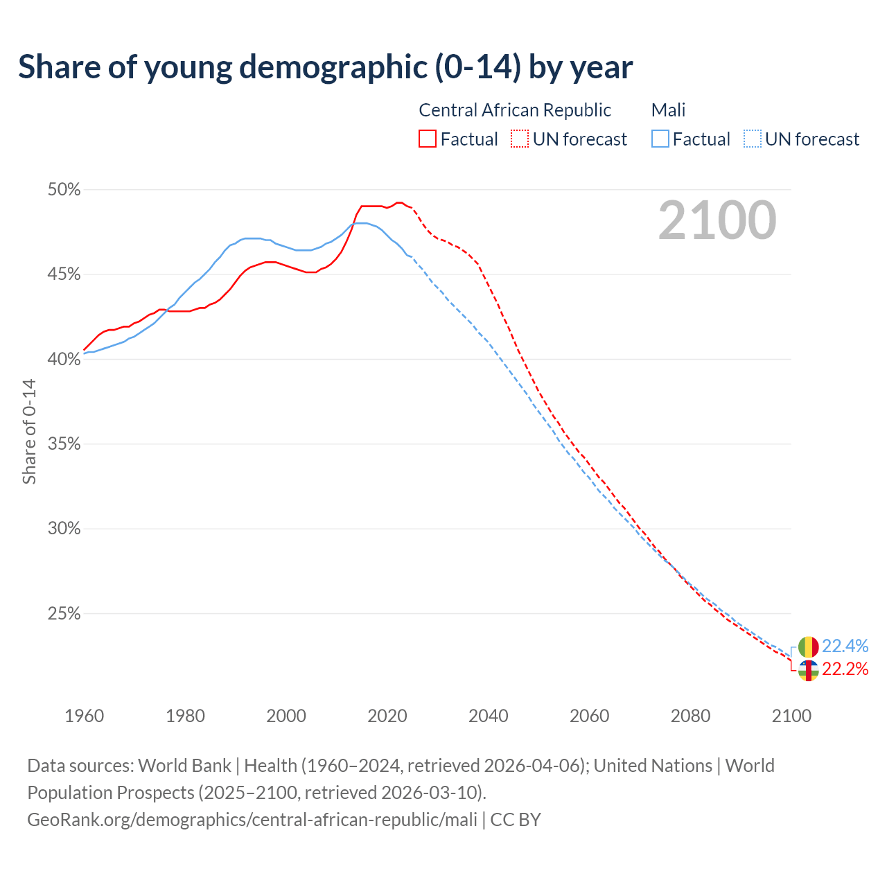 - The share of young demographic (0-15 years old) in the Central African Republic is 49% vs 46.1% in Mali.