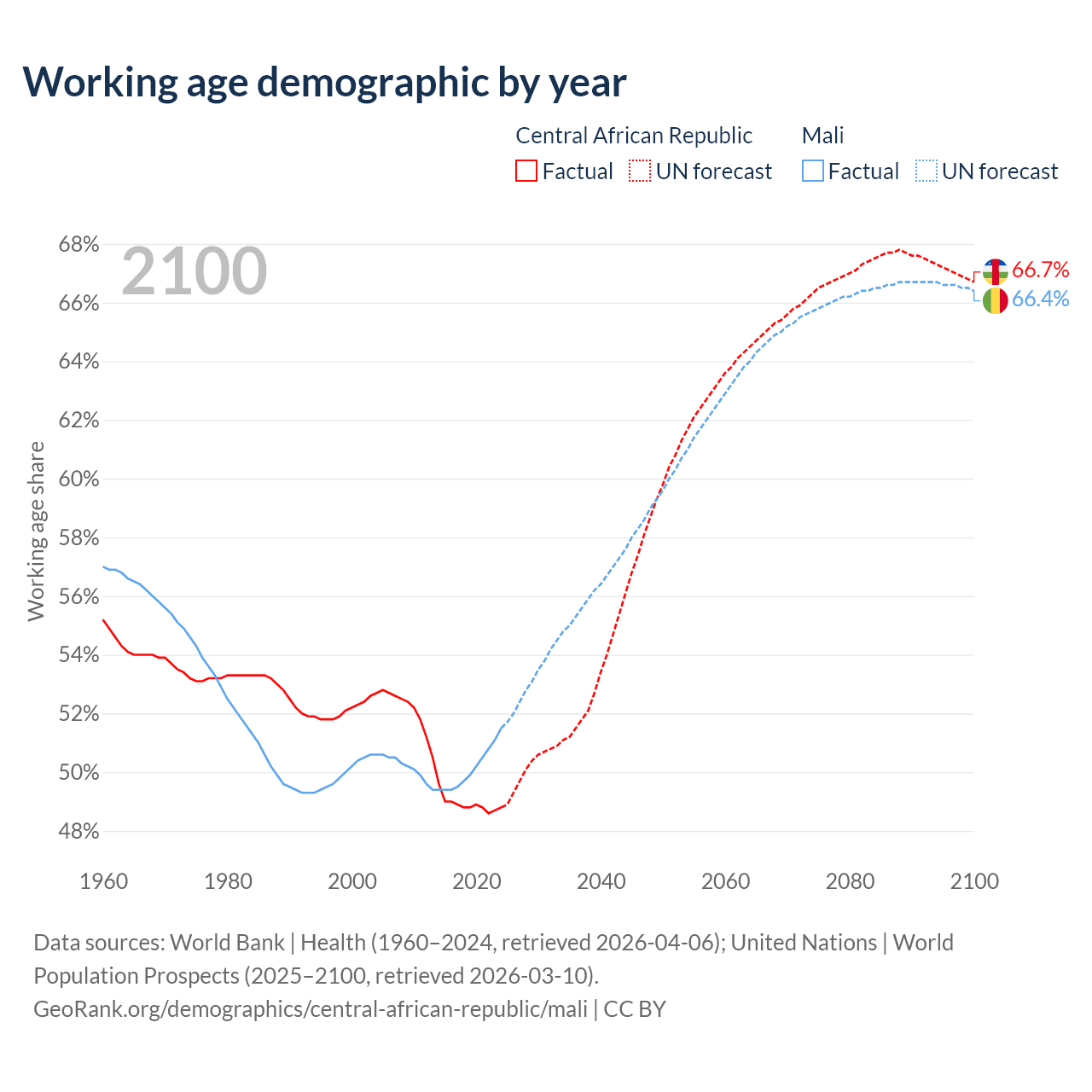 Median age Central African Republic vs Mali, 1960-2100