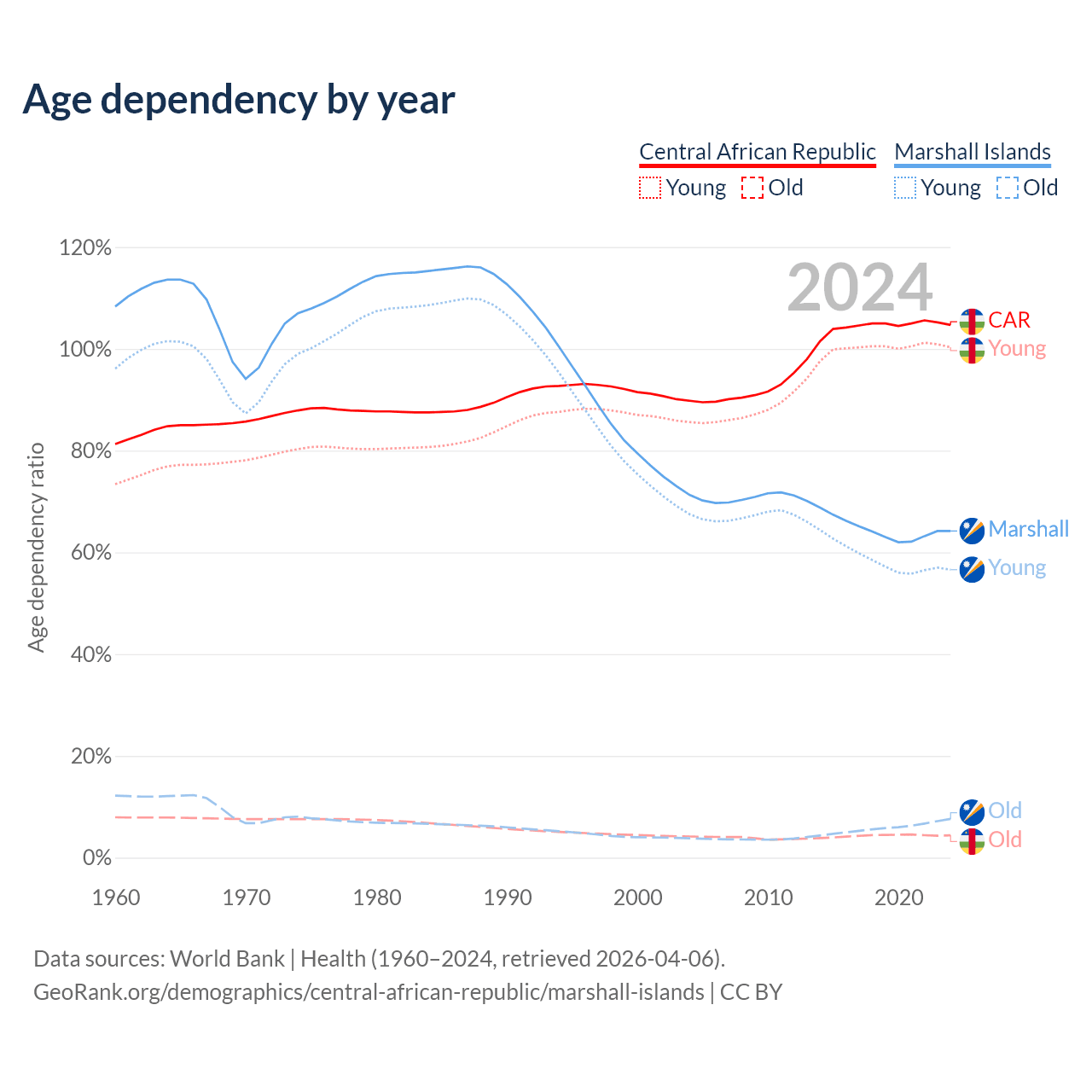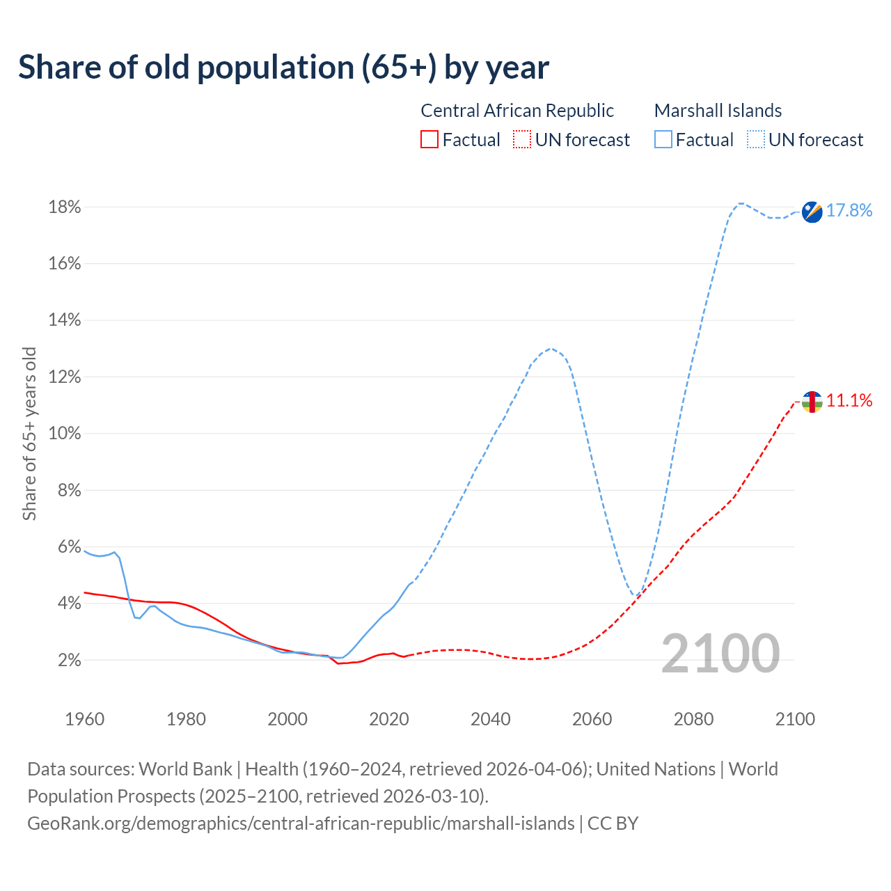 - The share of old-age demographic (65+) in the Central African Republic is 2.15% vs 4.64% in the Marshall Islands.