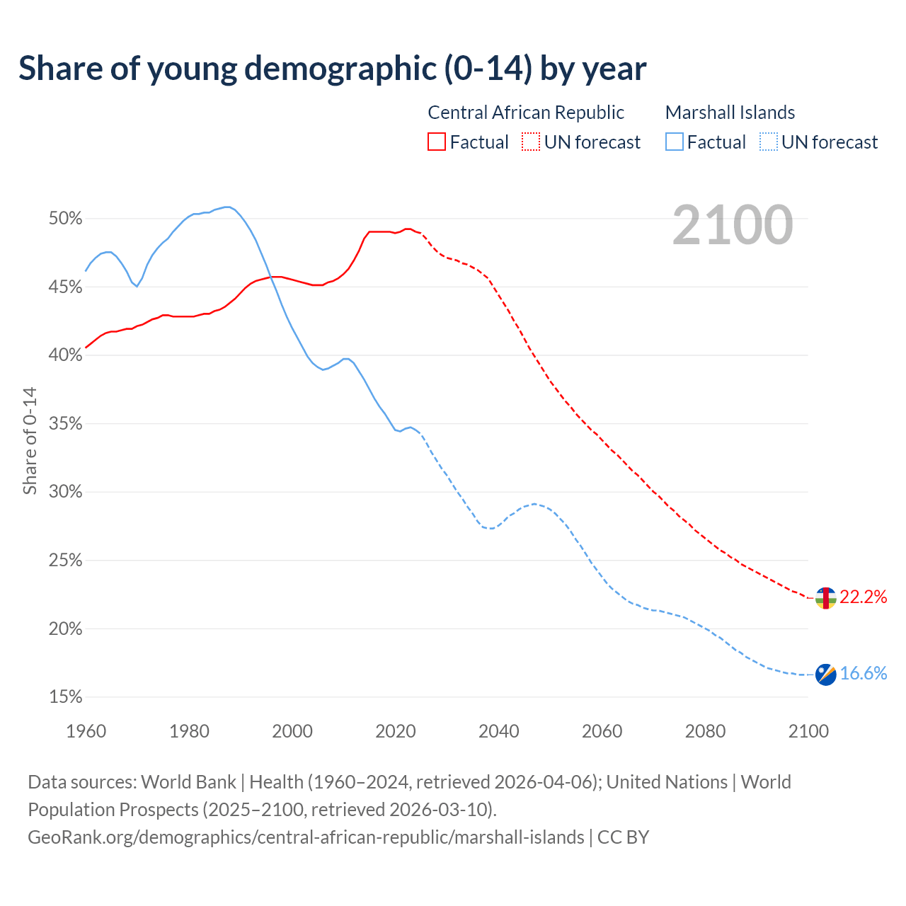 - The share of young demographic (0-15 years old) in the Central African Republic is 49% vs 34.5% in the Marshall Islands.
