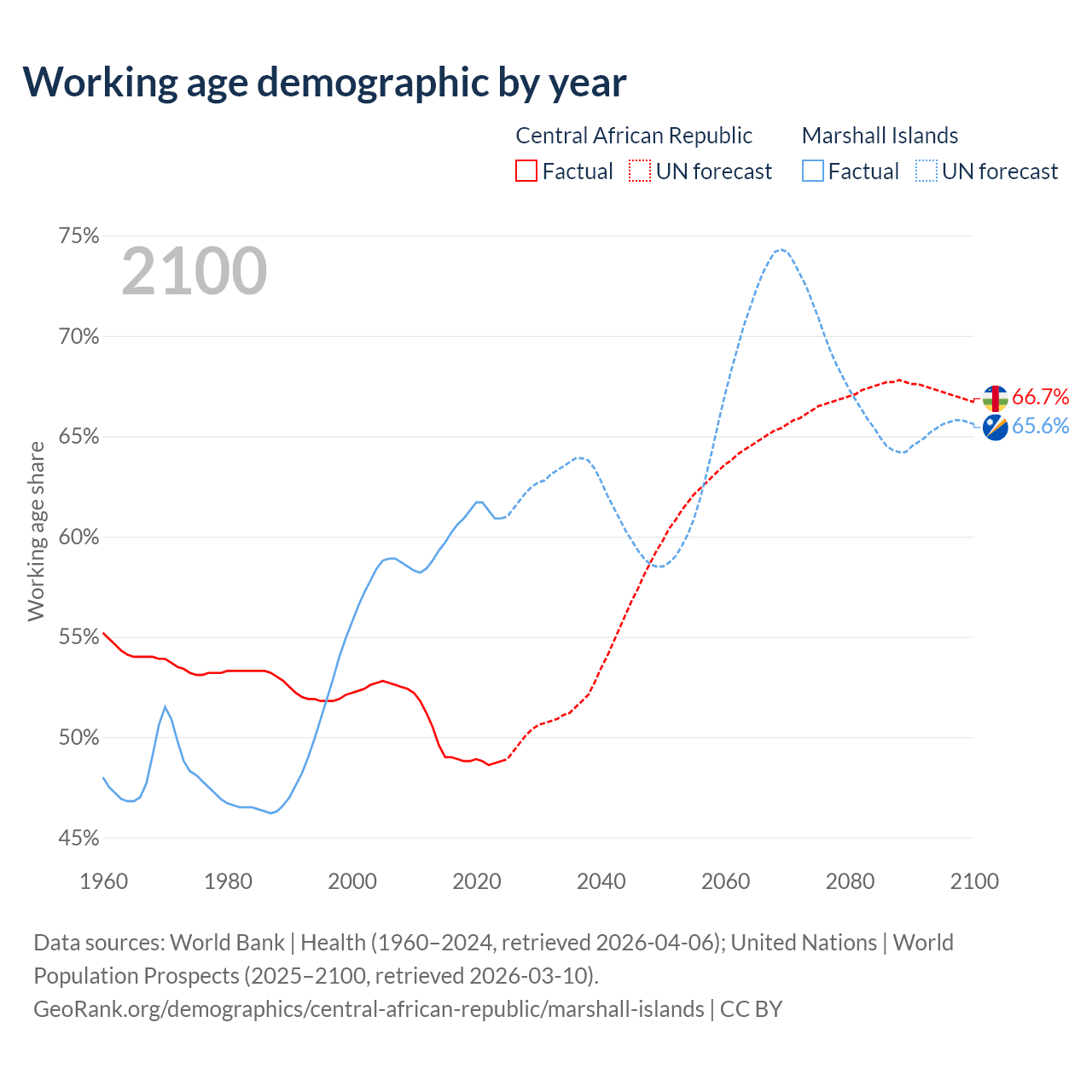 - The Central African Republic has 2.81M working age adults (aged 15-64) vs 21.3K in the Marshall Islands.