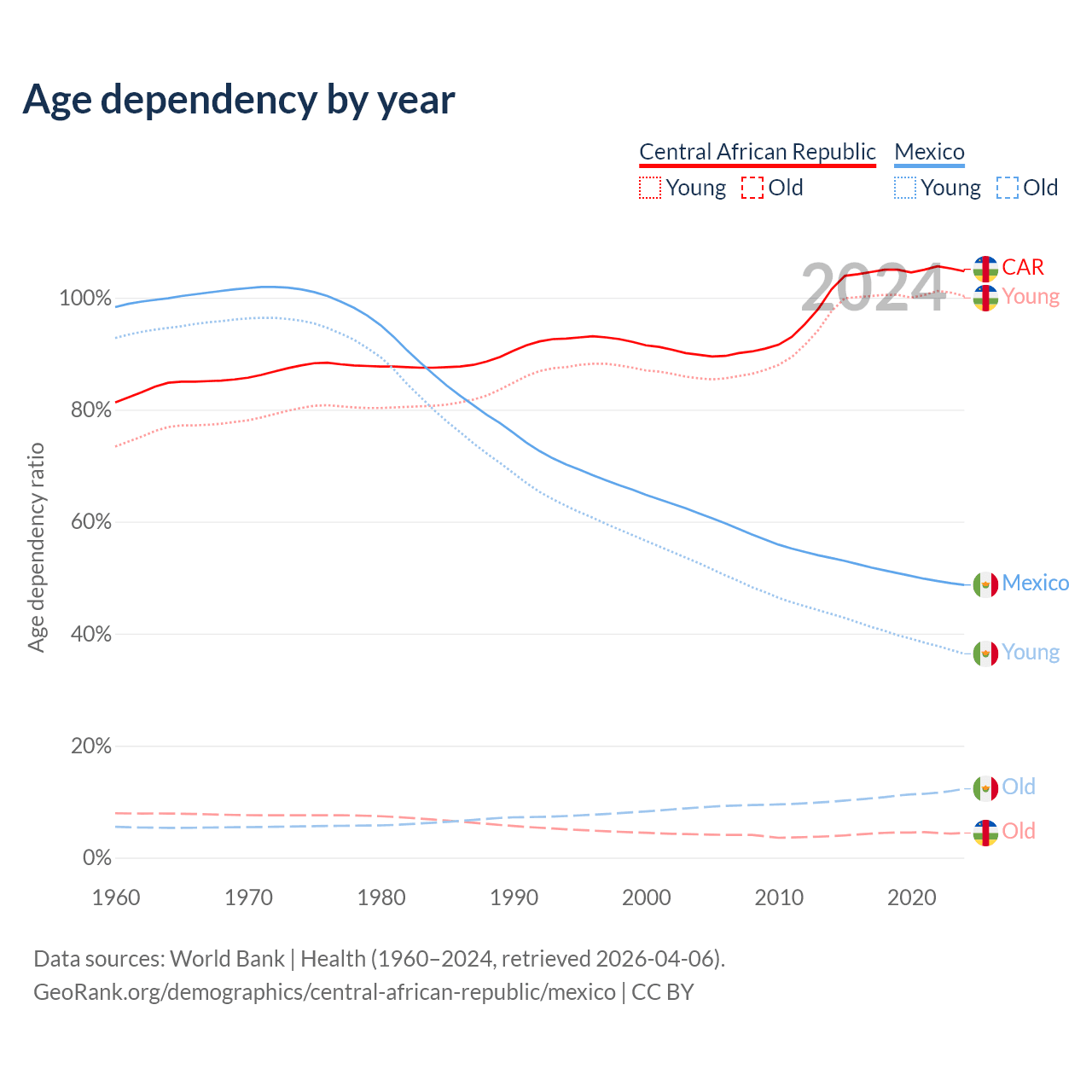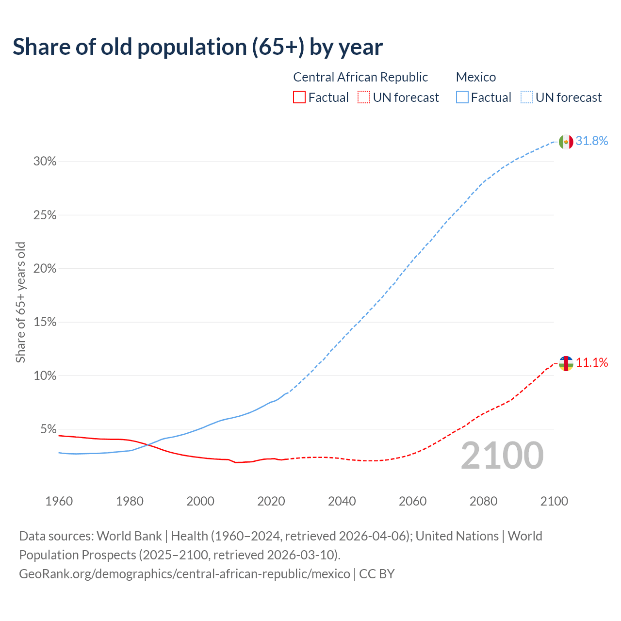 - The share of old-age demographic (65+) in the Central African Republic is 2.15% vs 8.25% in Mexico.