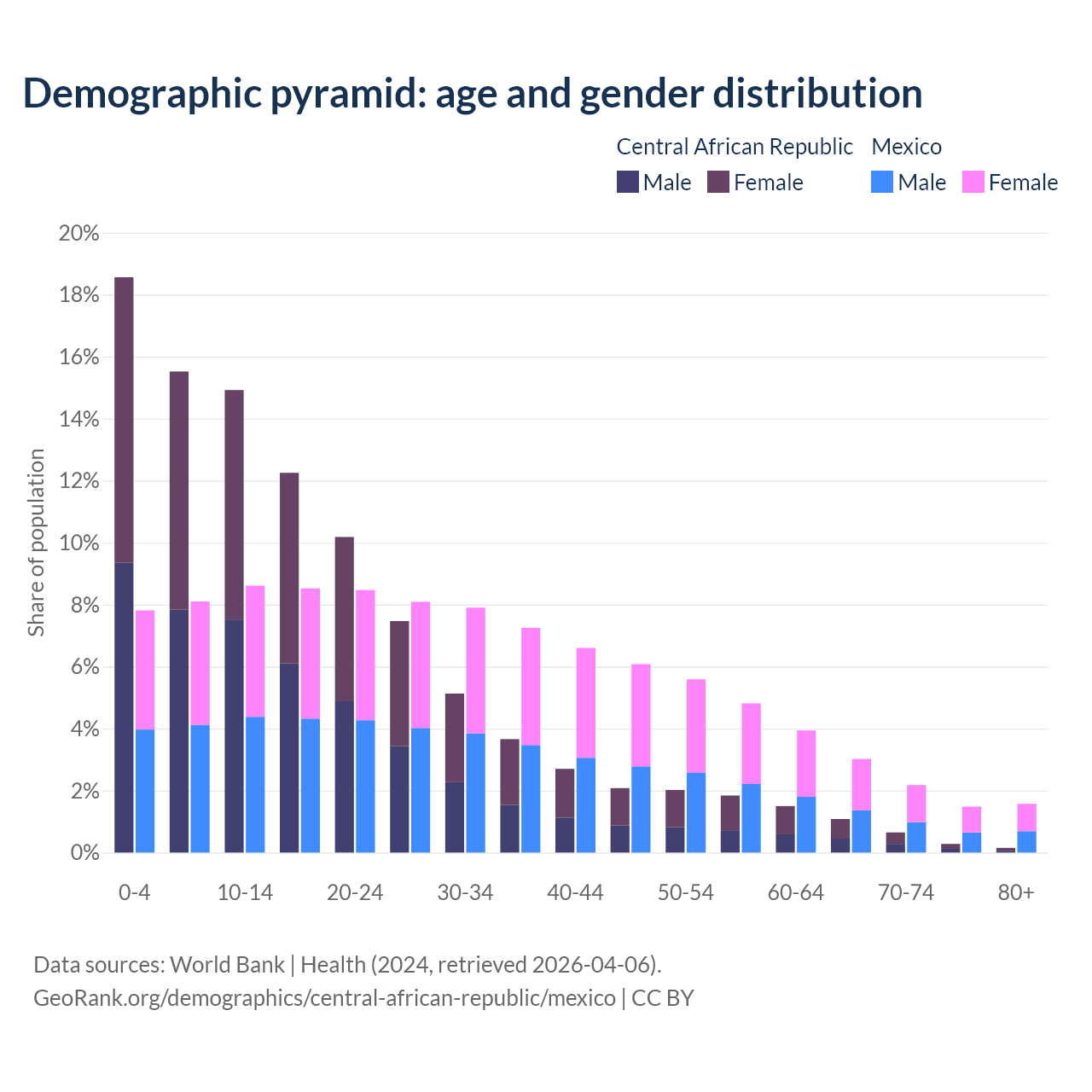 - The Central African Republic is ranked 196/196 by median age (oldest to youngest) vs 102/196 for Mexico.