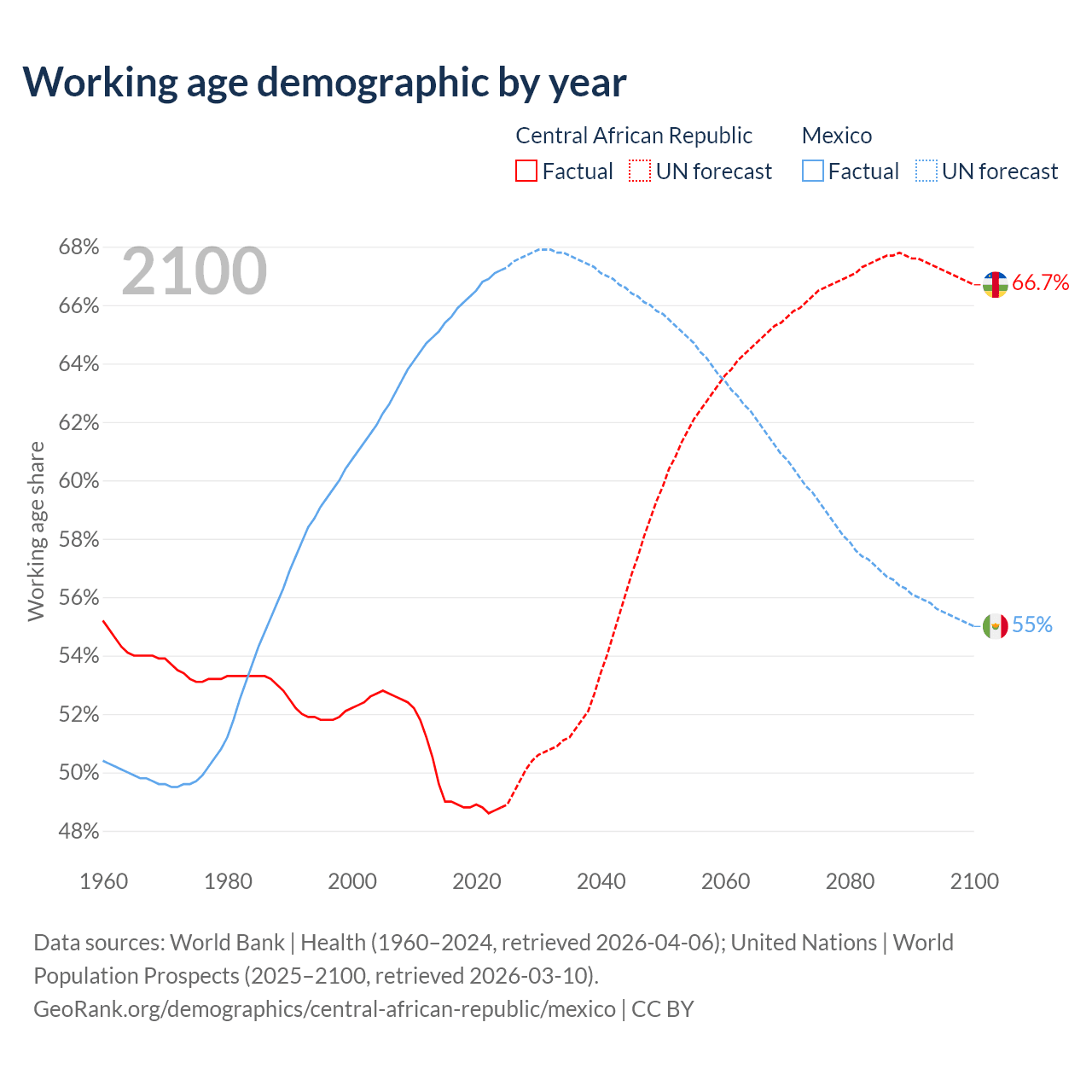 - The Central African Republic has 2.81M working age adults (aged 15-64) vs 89.6M in Mexico.