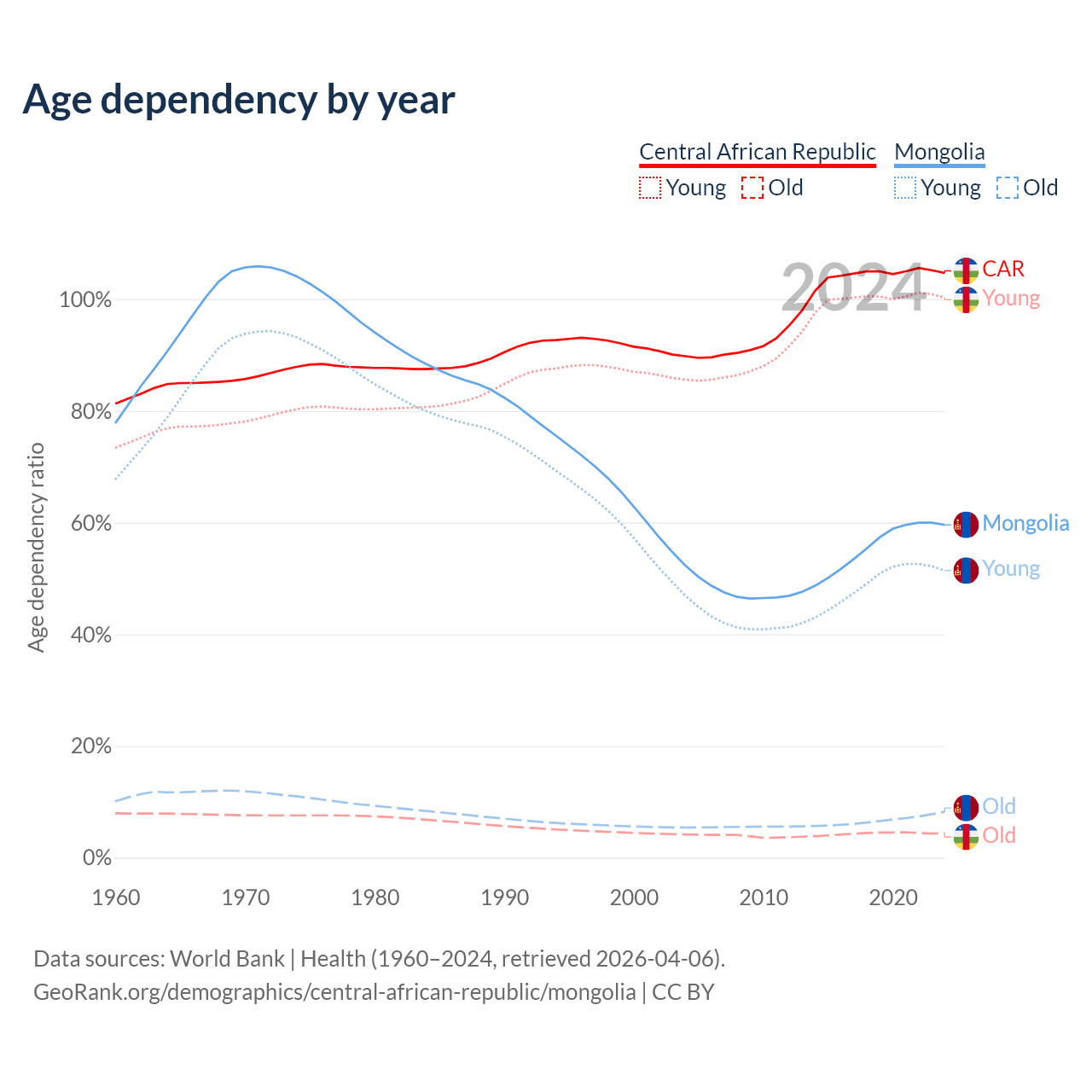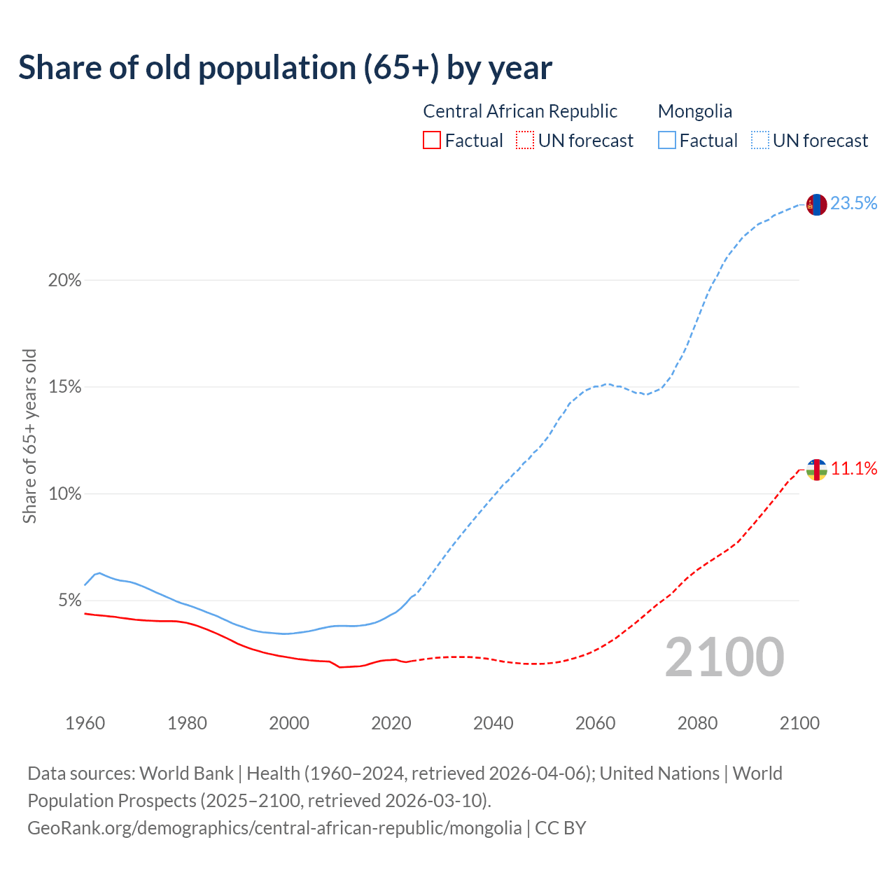- The share of old-age demographic (65+) in the Central African Republic is 2.15% vs 5.14% in Mongolia.