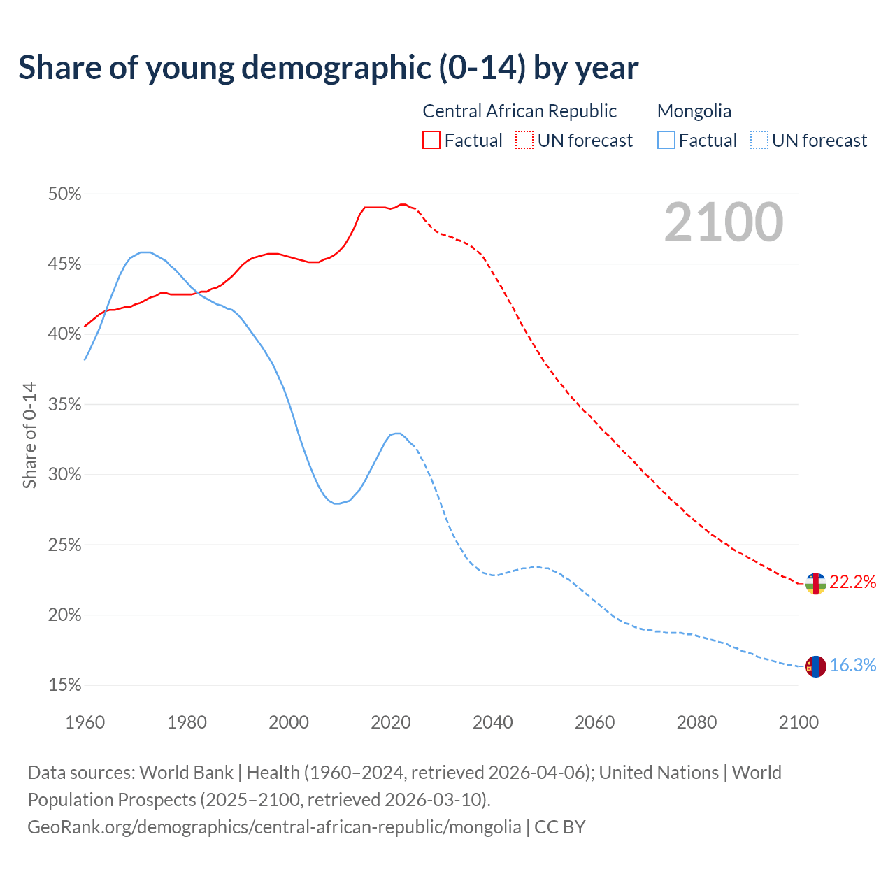 - The share of young demographic (0-15 years old) in the Central African Republic is 49% vs 32.2% in Mongolia.