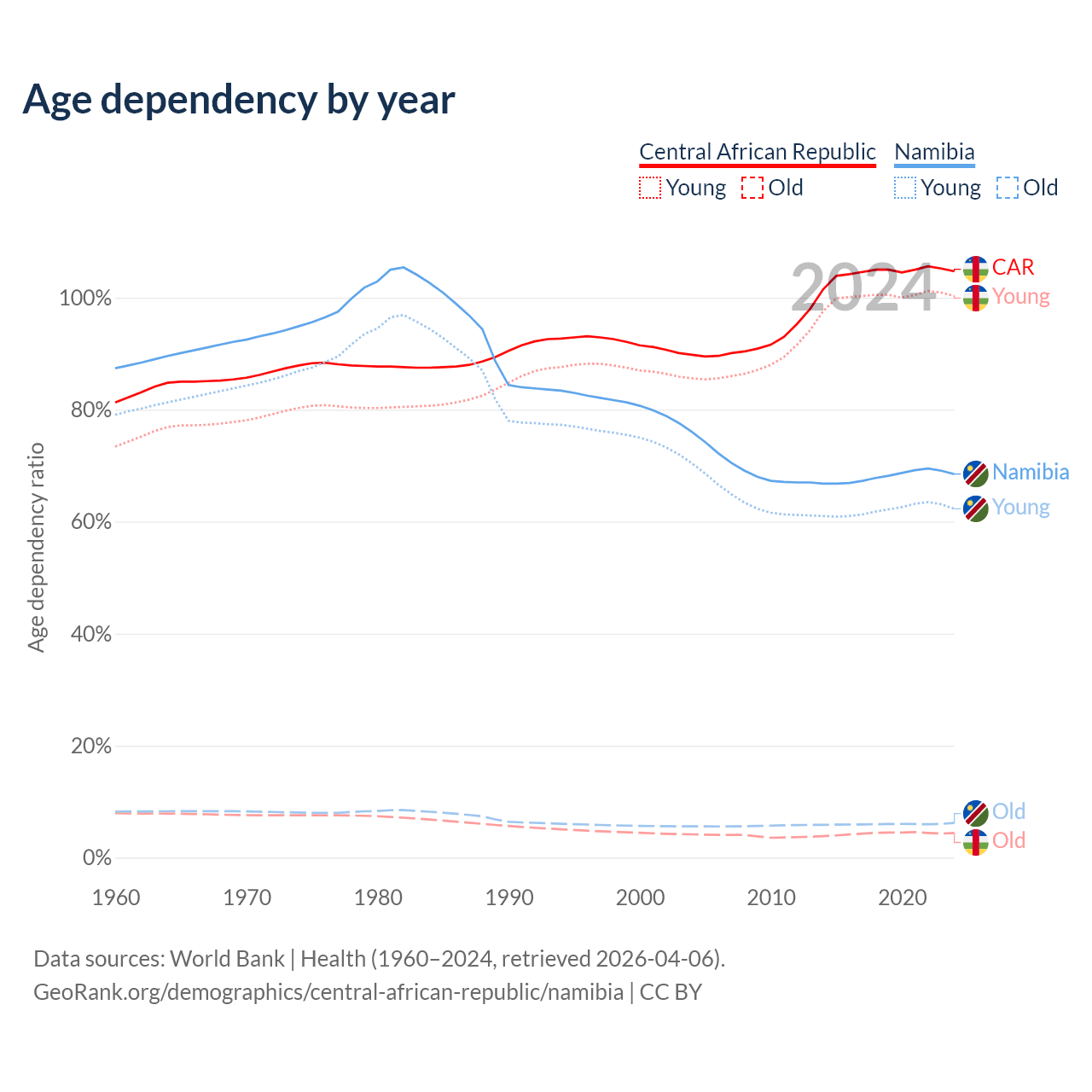 Data sources: World Bank | Health (1960–2024, retrieved 2026-04-06); U.S. Census Bureau (1960–2024, retrieved 2026-02-08).