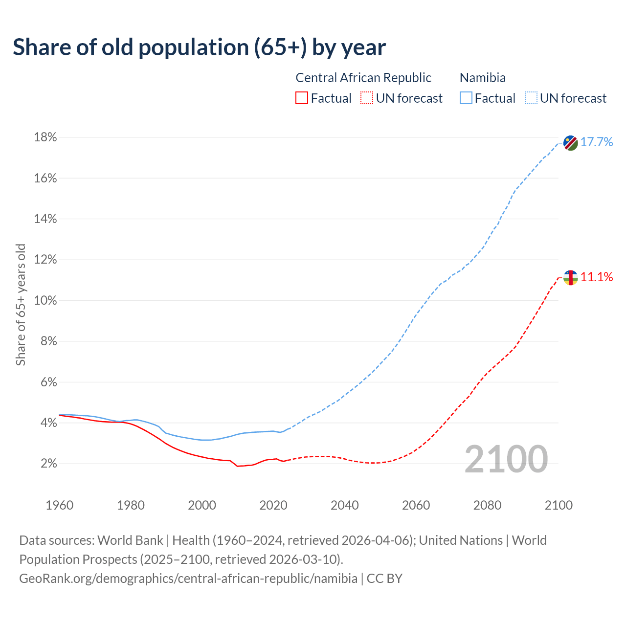 - The share of old-age demographic (65+) in the Central African Republic is 2.15% vs 3.67% in Namibia.