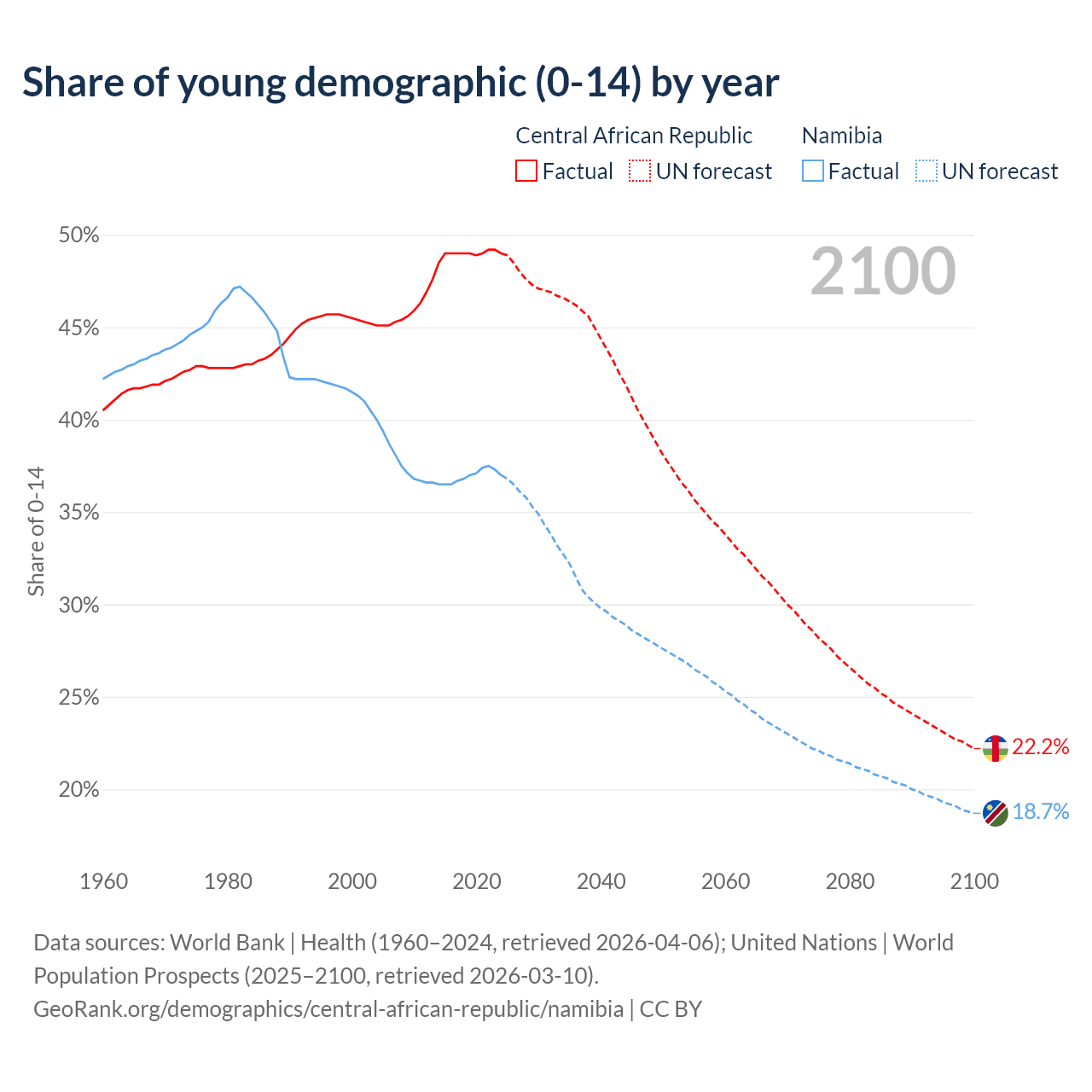 Median age Central African Republic vs Namibia, 1960-2100