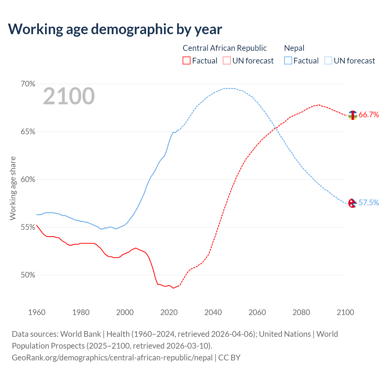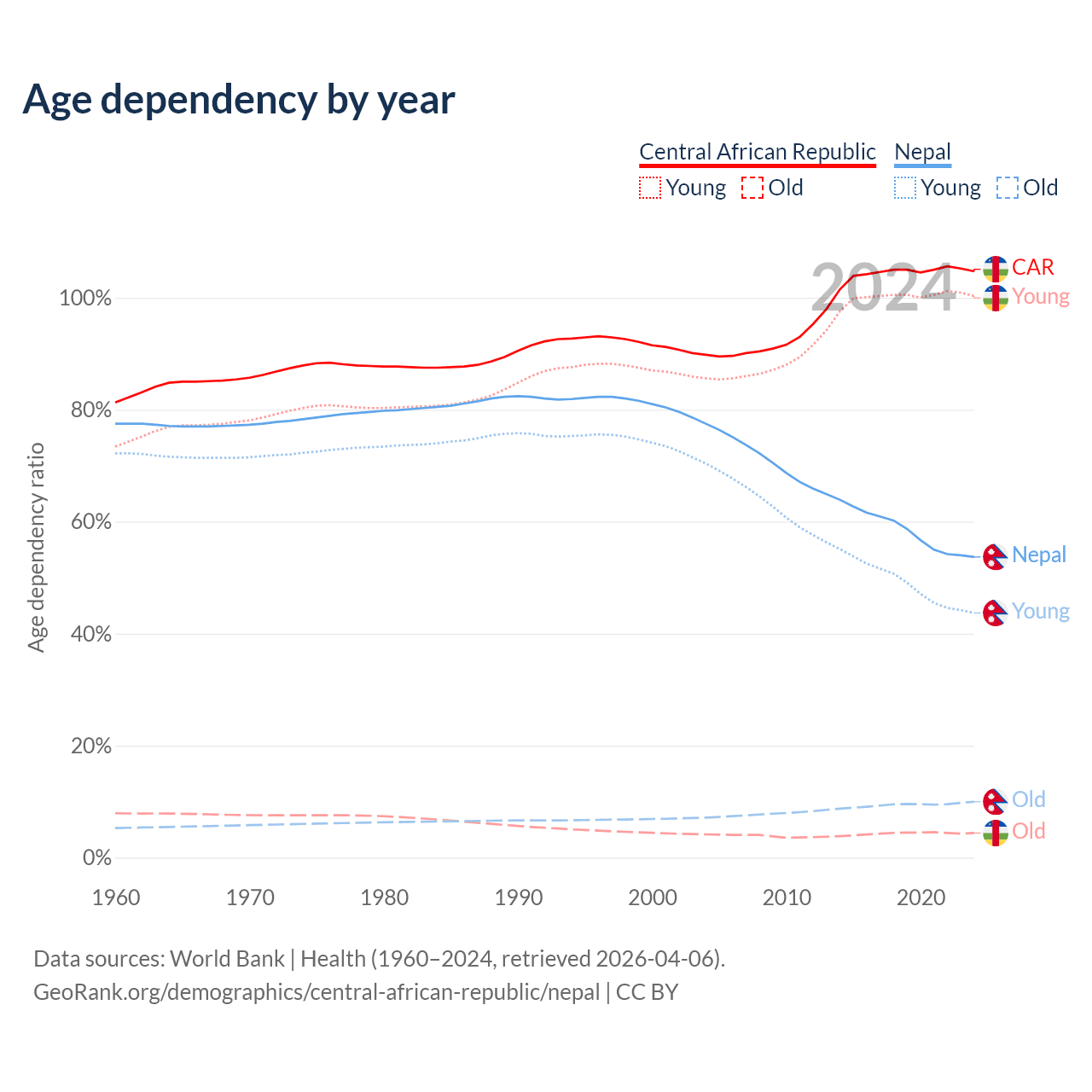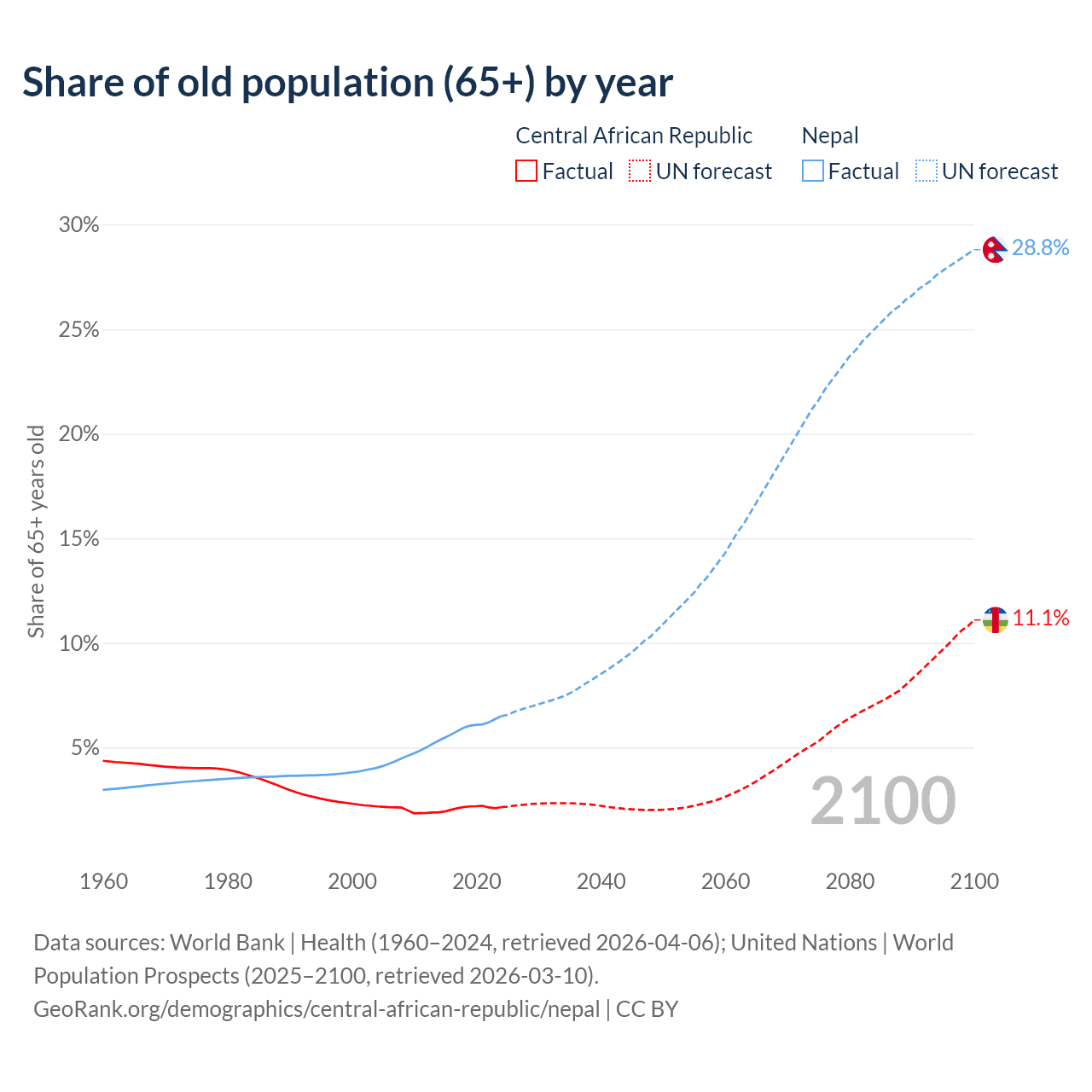 - The share of old-age demographic (65+) in the Central African Republic is 2.15% vs 6.5% in Nepal.