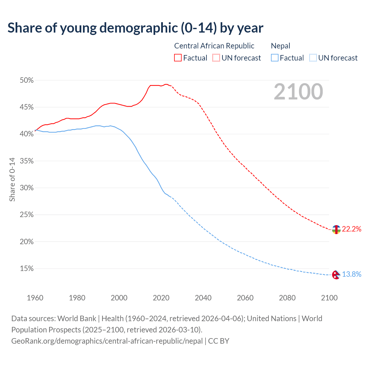 - The share of young demographic (0-15 years old) in the Central African Republic is 49% vs 28.4% in Nepal.