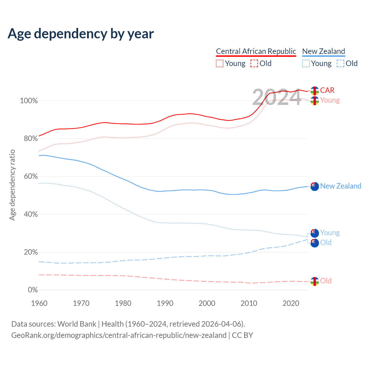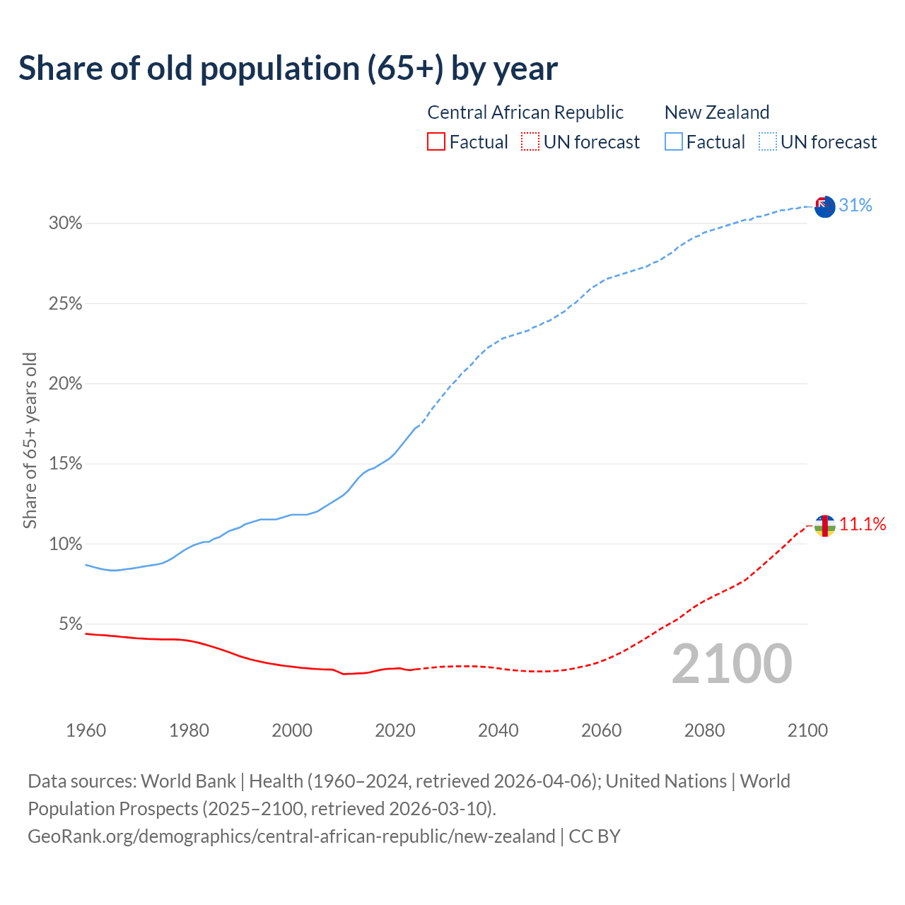 - The share of old-age demographic (65+) in the Central African Republic is 2.15% vs 17.2% in New Zealand.