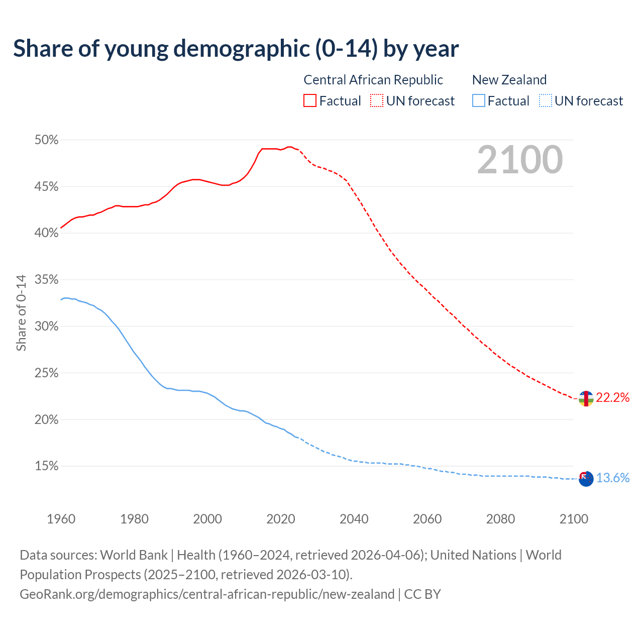 - The share of young demographic (0-15 years old) in the Central African Republic is 49% vs 18.1% in New Zealand.