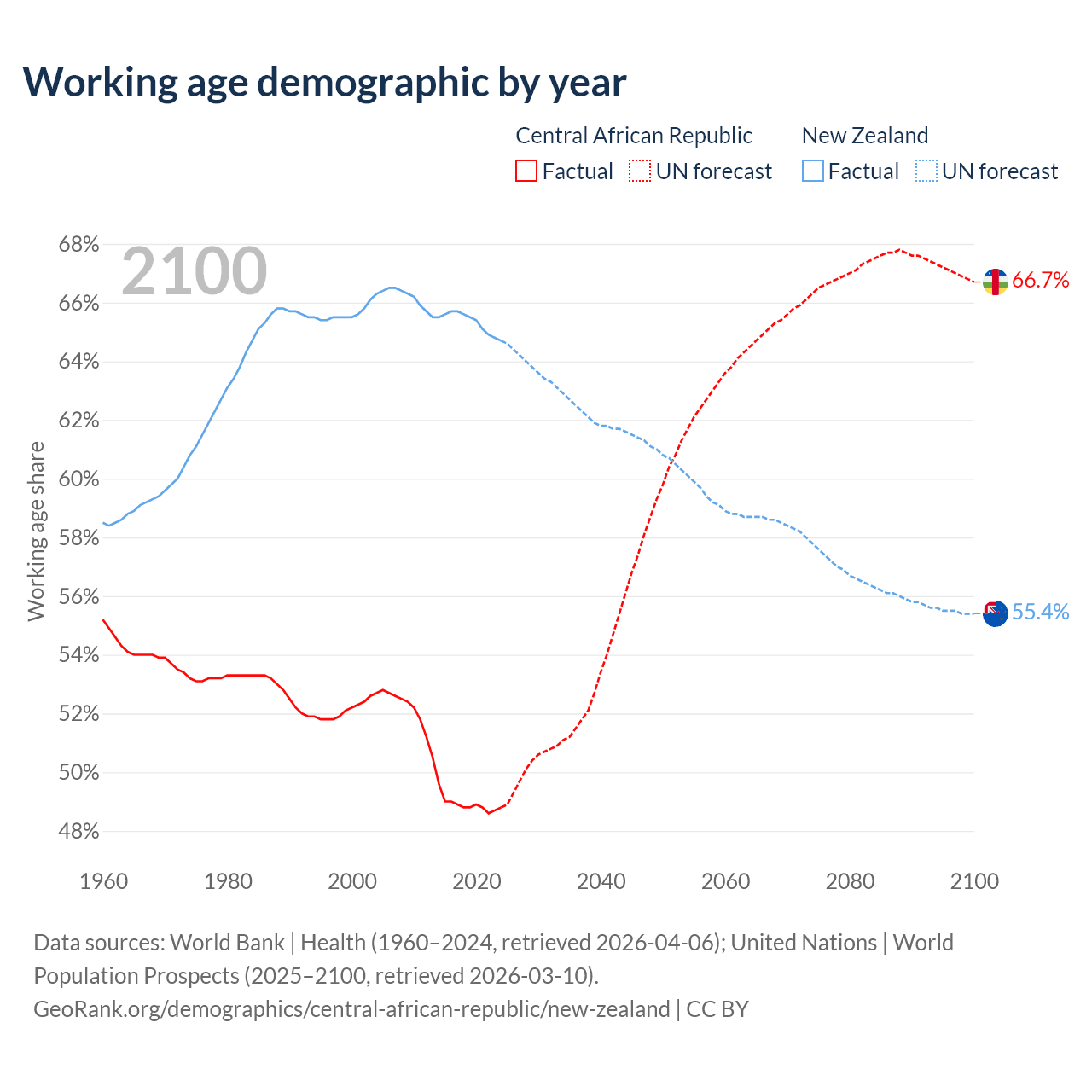 Median age Central African Republic vs New Zealand, 1960-2100