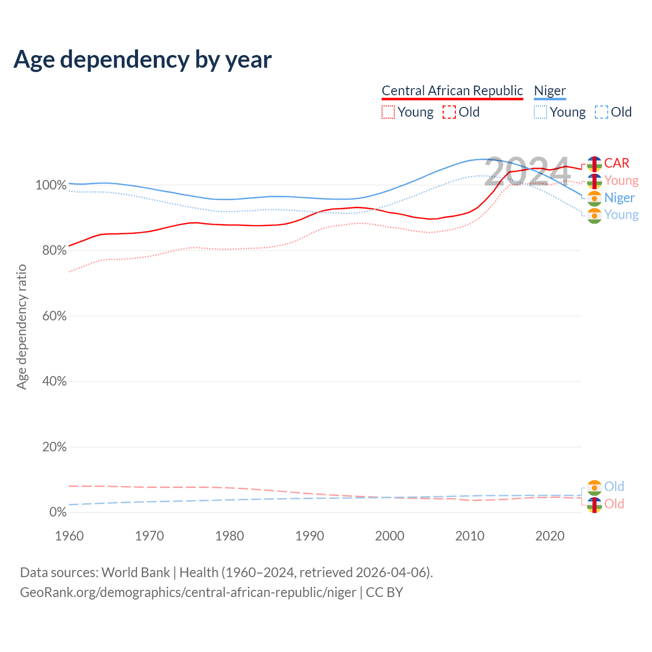 Data sources: World Bank | Health (1960–2024, retrieved 2026-04-06); U.S. Census Bureau (1960–2024, retrieved 2026-02-08).