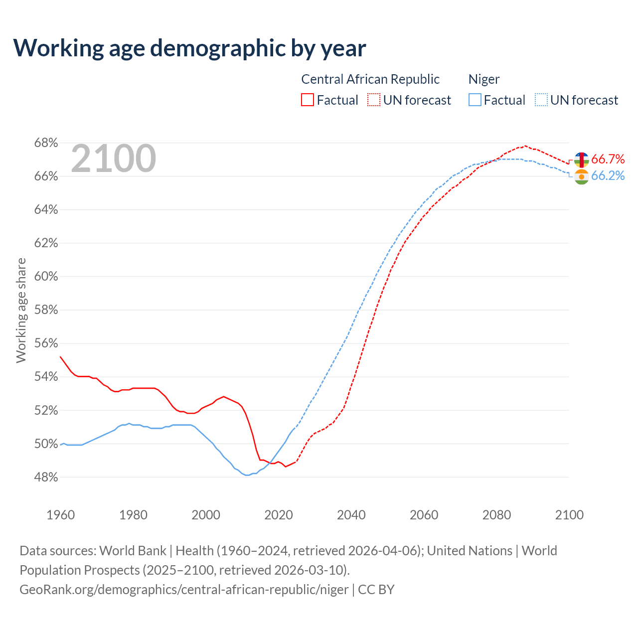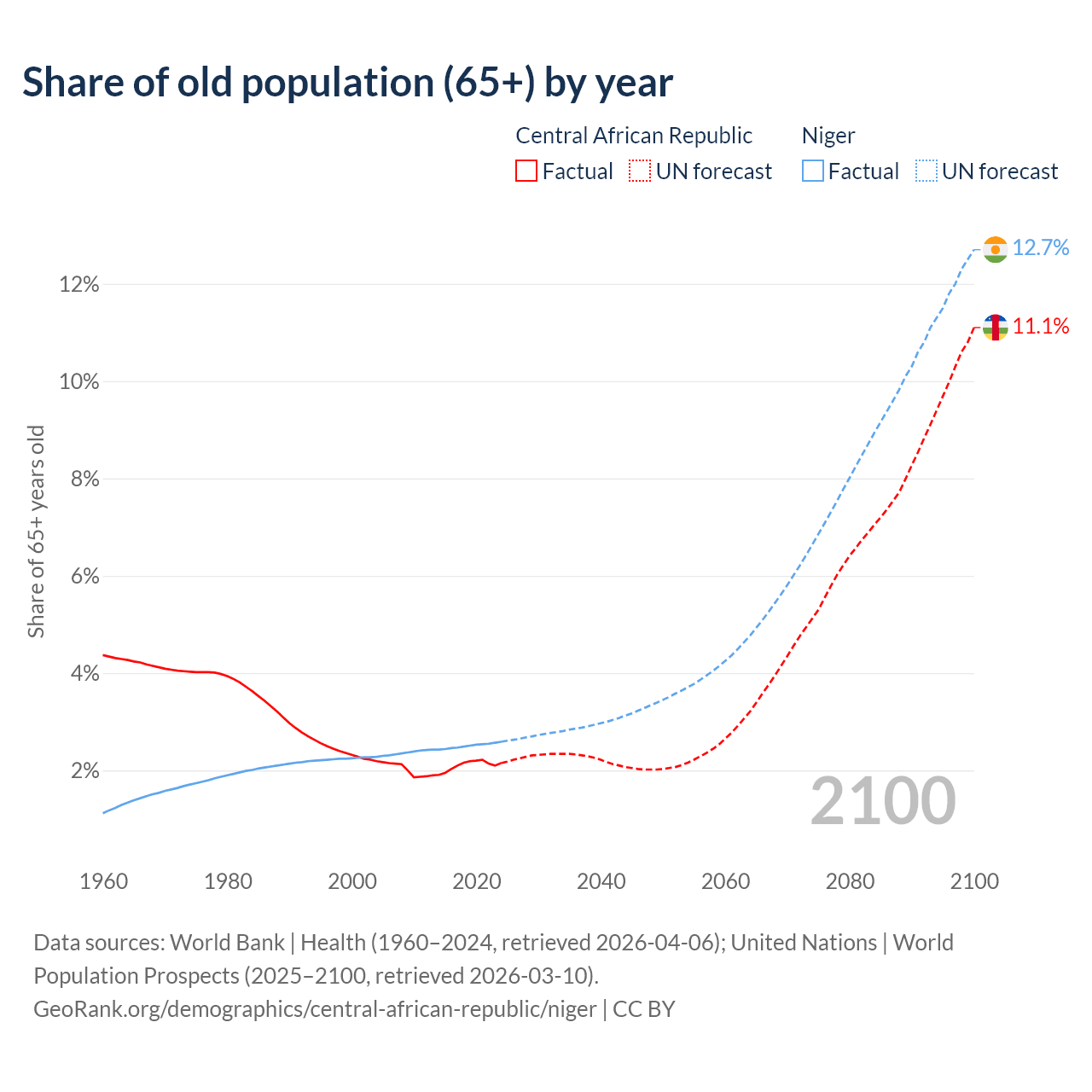 The share of older people aged 65 and over is 2.15% in the Central African Republic and 2.59% in Niger. Life expectancy in the Central African Republic compared to Niger .
