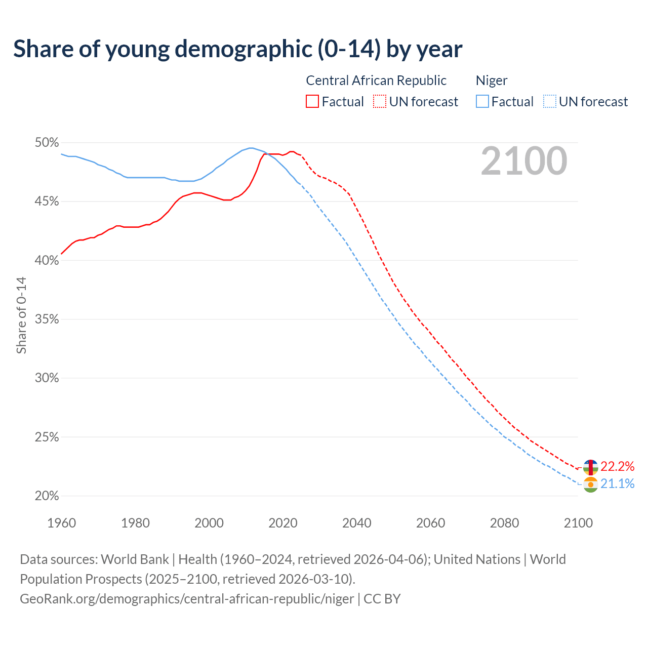 - The share of young demographic (0-15 years old) in the Central African Republic is 49% vs 46.6% in Niger.