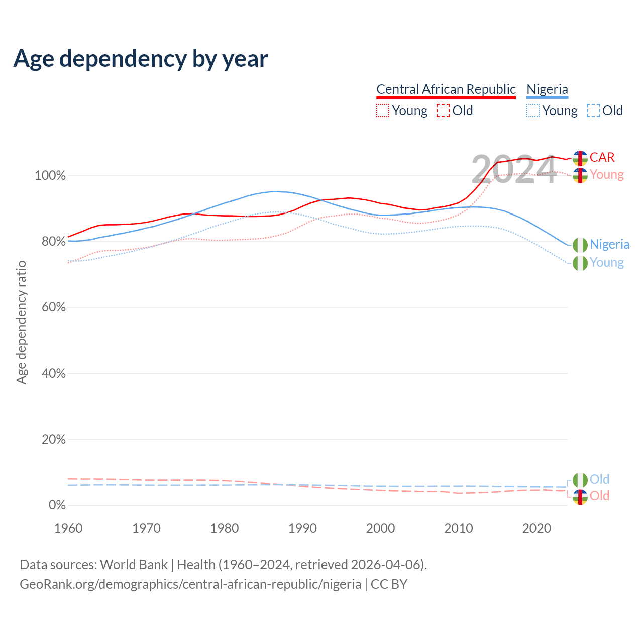- The Central African Republic is ranked 196/196 by median age (oldest to youngest) vs 178/196 for Nigeria.