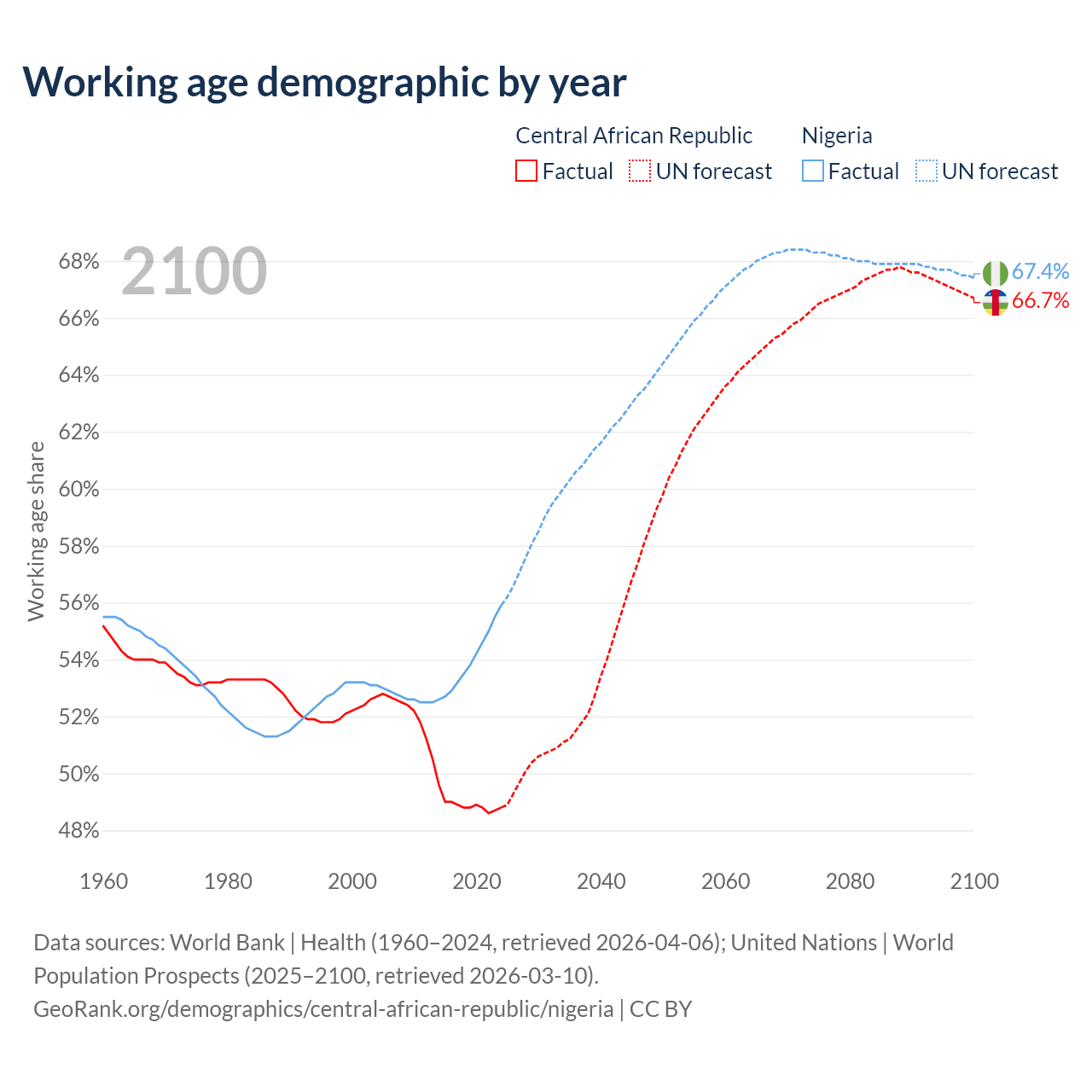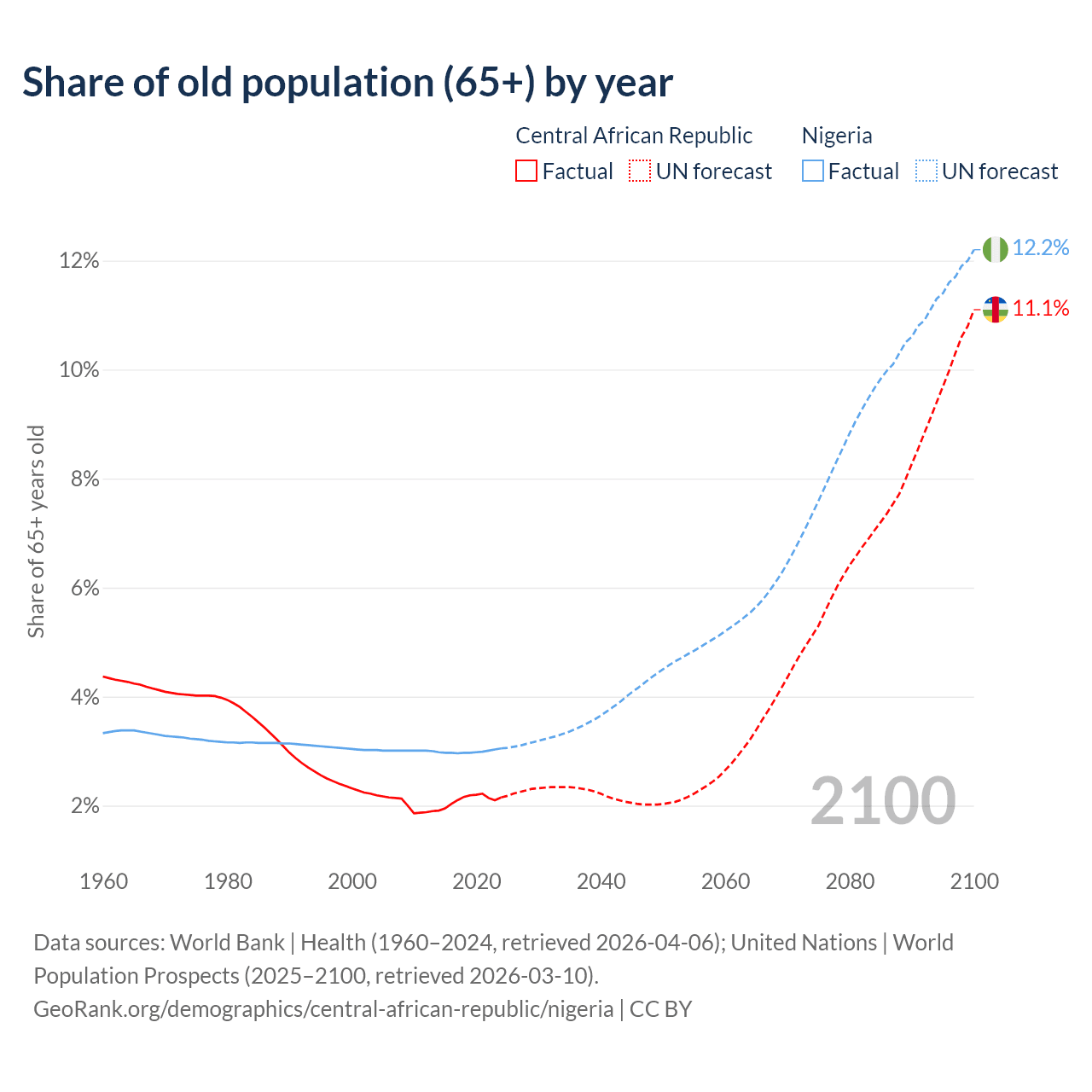 The share of older people aged 65 and over is 2.15% in the Central African Republic and 3.05% in Nigeria. Life expectancy in the Central African Republic compared to Nigeria .