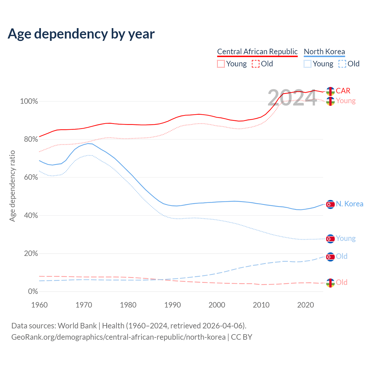 - The share of old-age demographic (65+) in the Central African Republic is 2.15% vs 12.4% in North Korea.