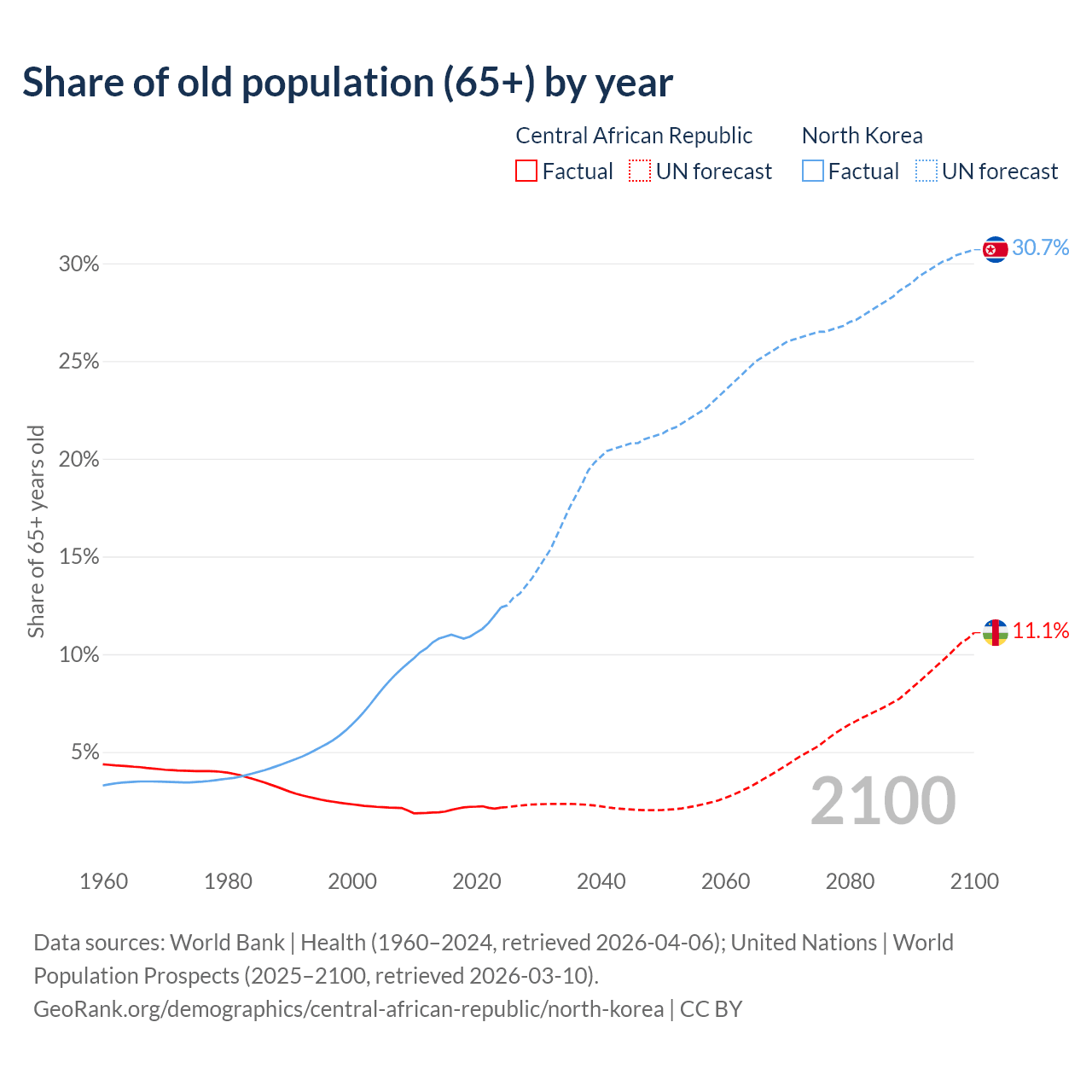 The share of older people aged 65 and over is 2.15% in the Central African Republic and 12.4% in North Korea. Life expectancy in the Central African Republic compared to North Korea .