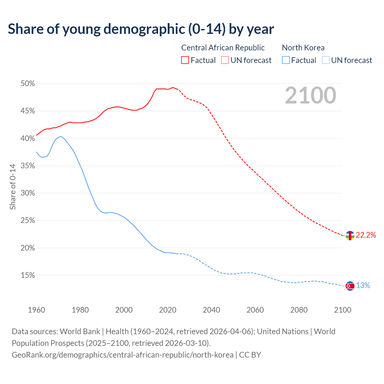 - The share of young demographic (0-15 years old) in the Central African Republic is 49% vs 18.9% in North Korea.