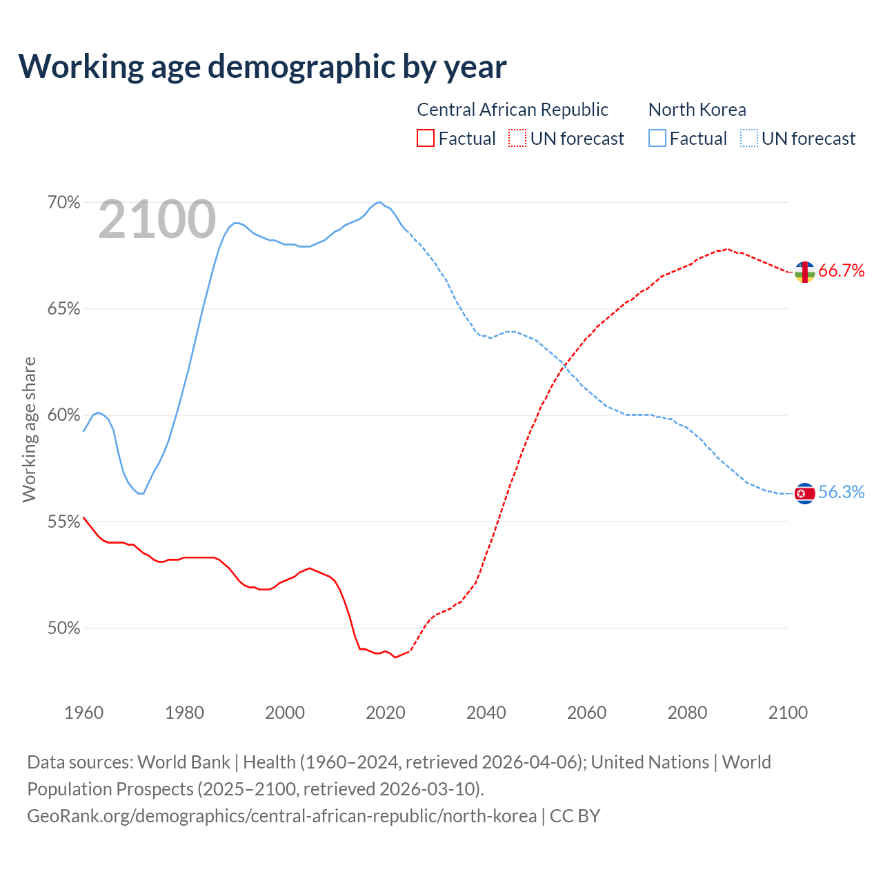 Median age Central African Republic vs North Korea, 1960-2100