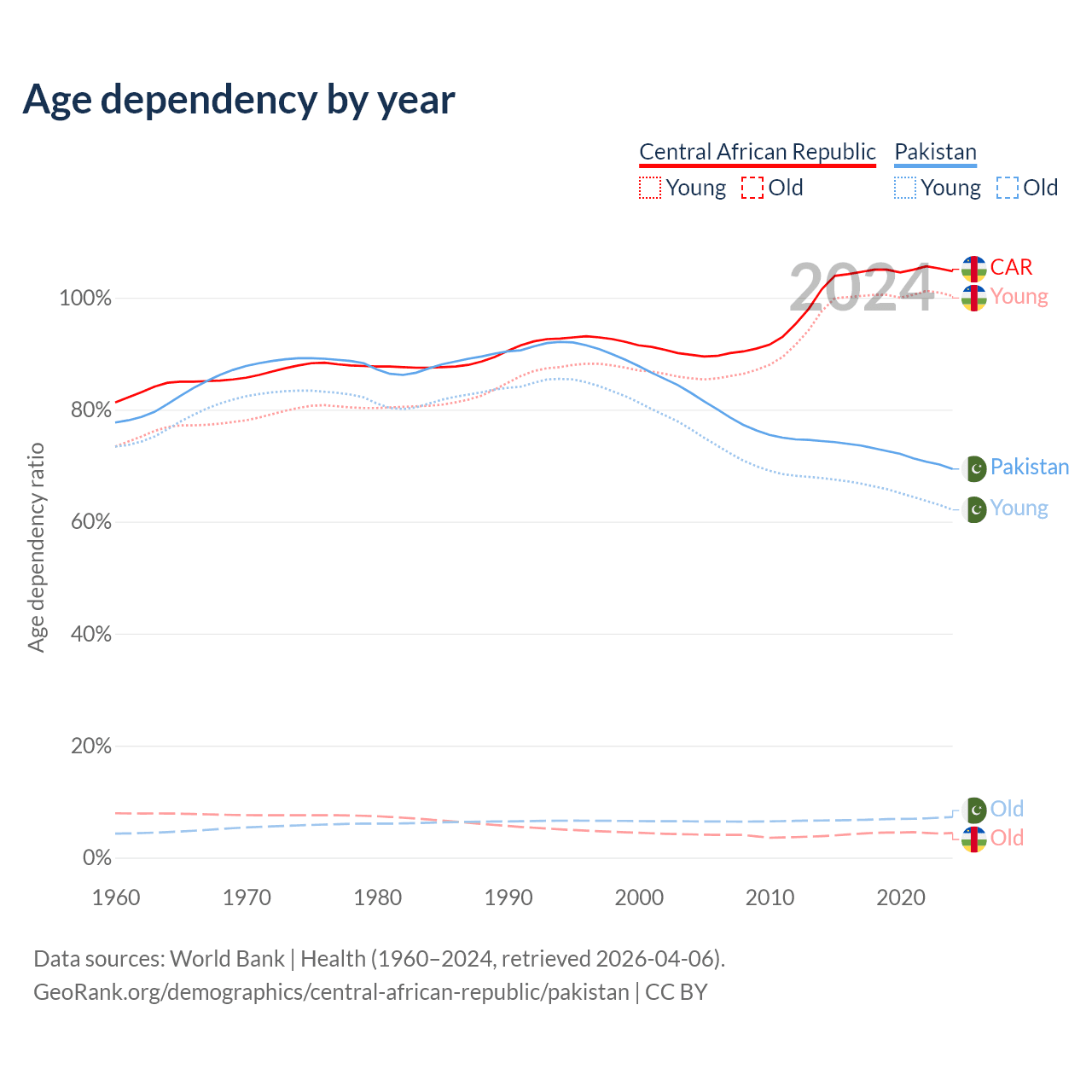 - The Central African Republic is ranked 196/196 by median age (oldest to youngest) vs 154/196 for Pakistan.