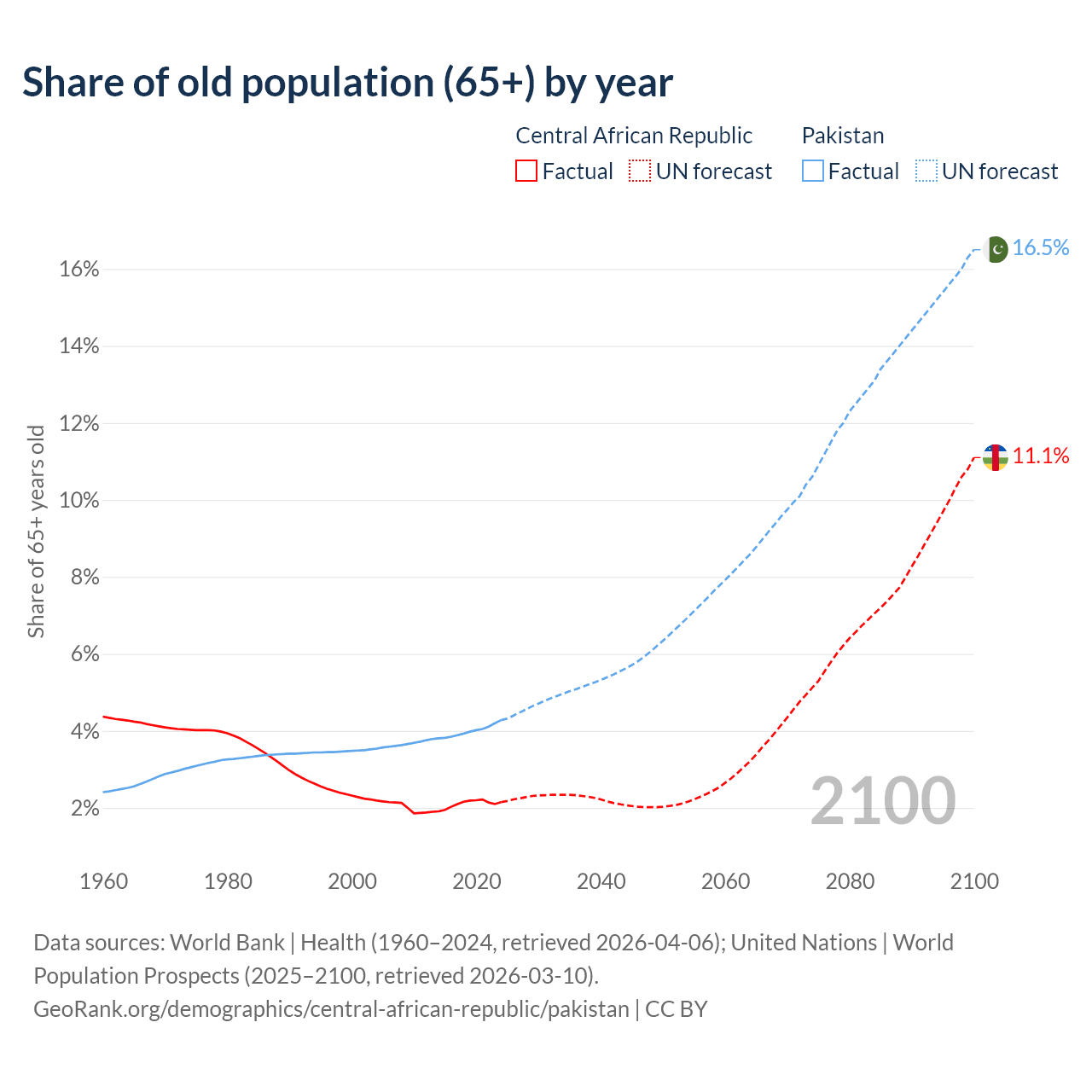 The share of older people aged 65 and over is 2.15% in the Central African Republic and 4.28% in Pakistan. Life expectancy in the Central African Republic compared to Pakistan .
