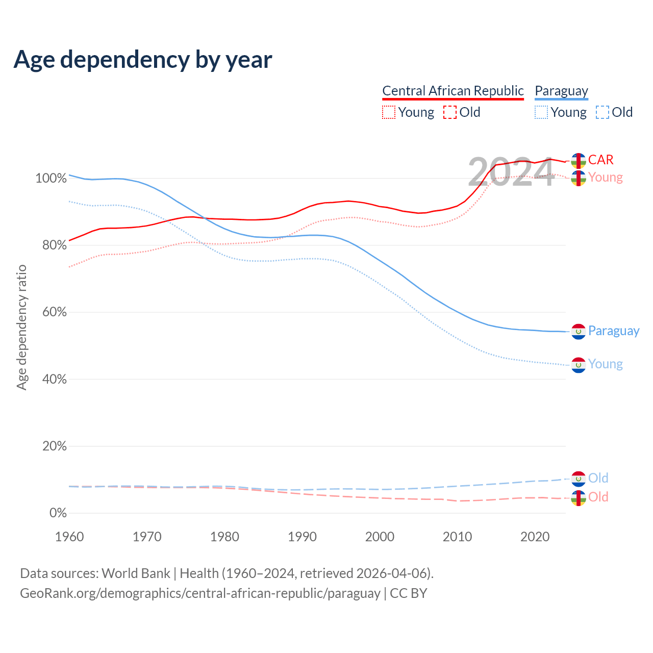 - The share of old-age demographic (65+) in the Central African Republic is 2.15% vs 6.54% in Paraguay.