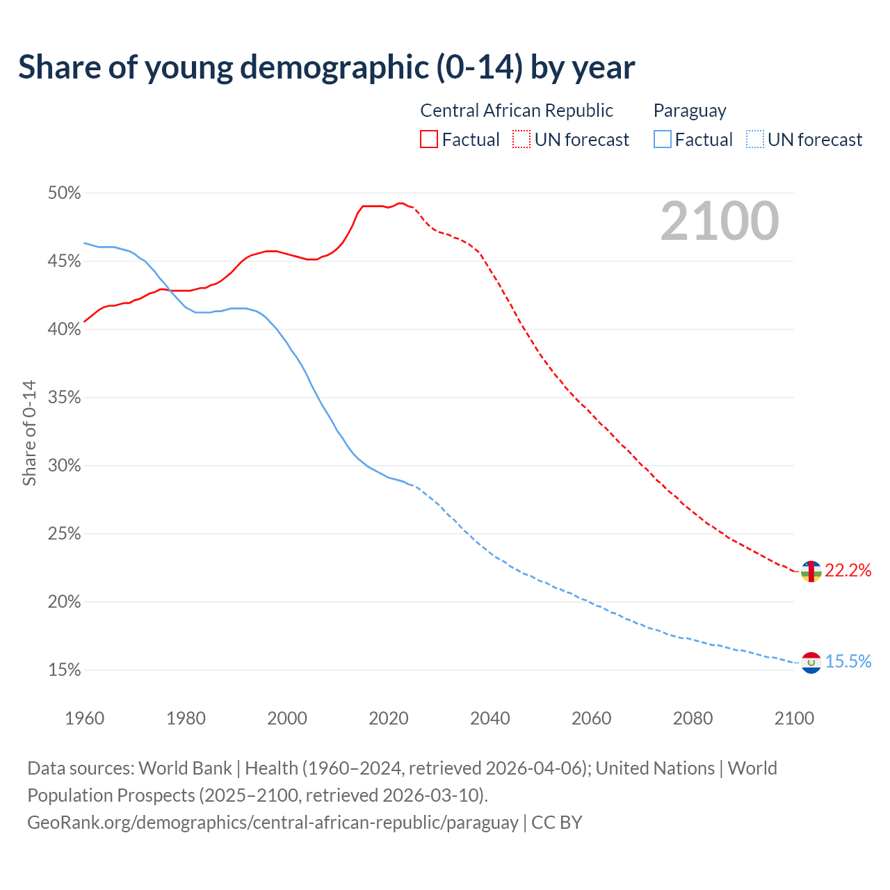 - The share of young demographic (0-15 years old) in the Central African Republic is 49% vs 28.6% in Paraguay.