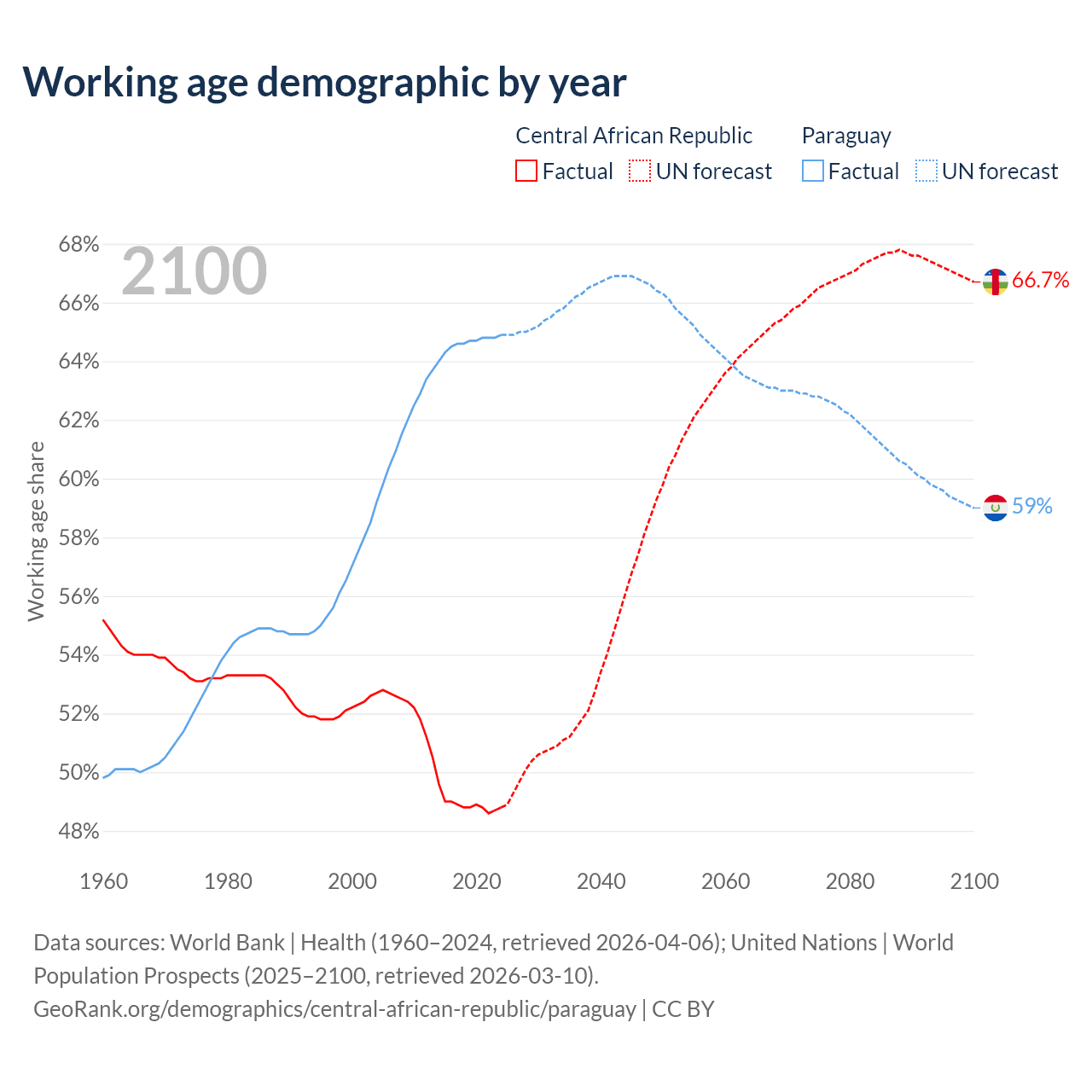 - The Central African Republic has 2.81M working age adults (aged 15-64) vs 4.62M in Paraguay.