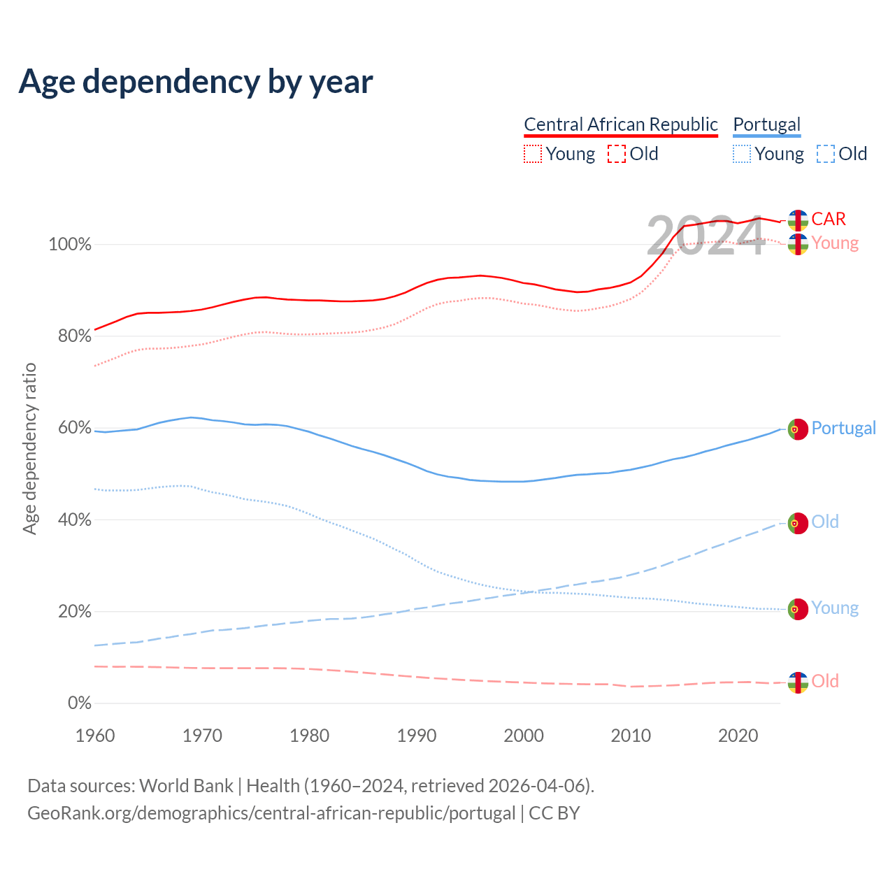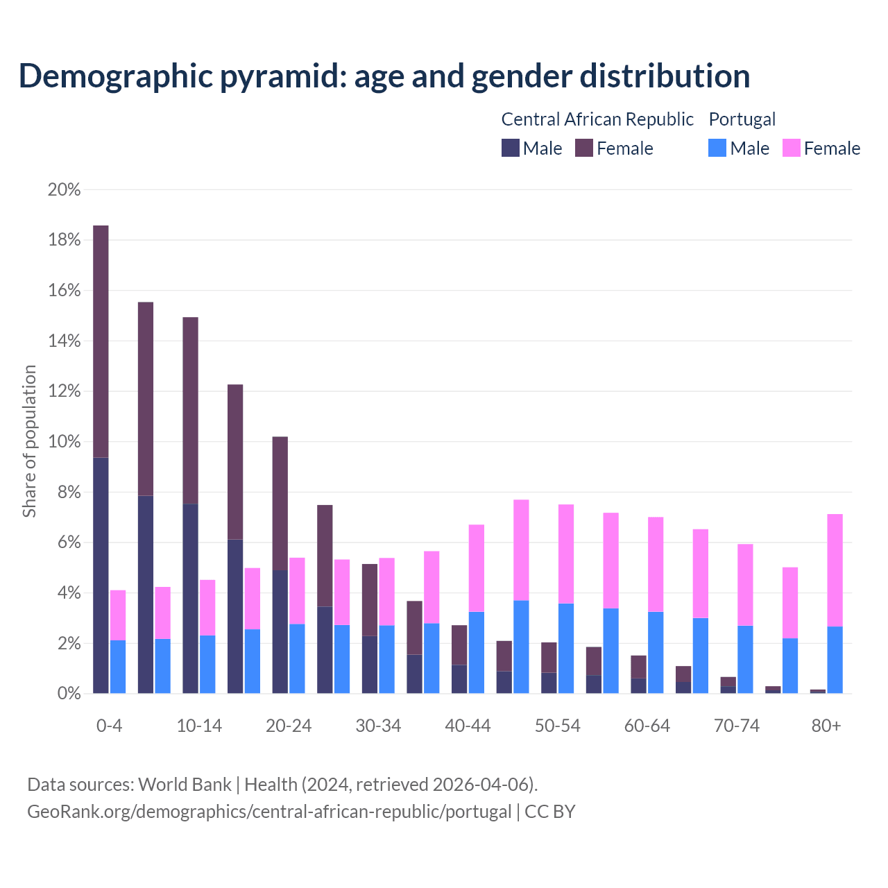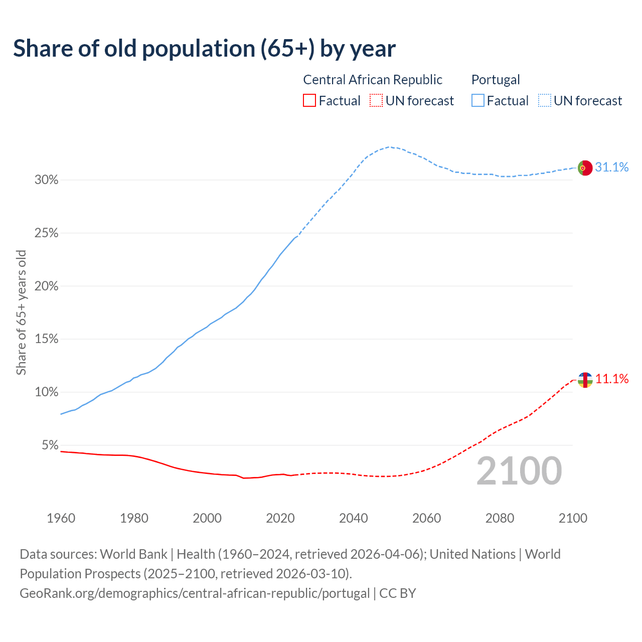 - The share of old-age demographic (65+) in the Central African Republic is 2.15% vs 24.5% in Portugal.