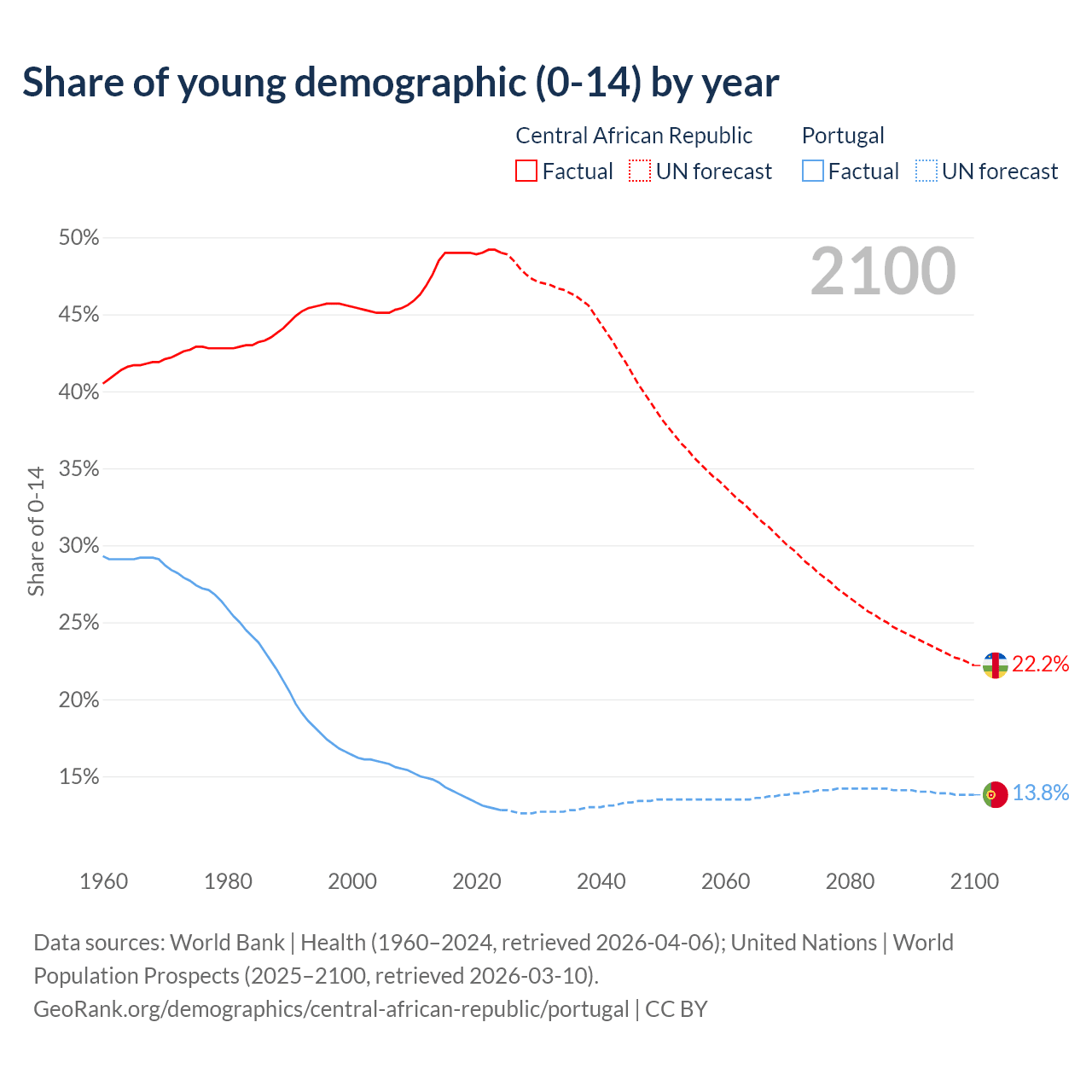 - The share of young demographic (0-15 years old) in the Central African Republic is 49% vs 12.8% in Portugal.