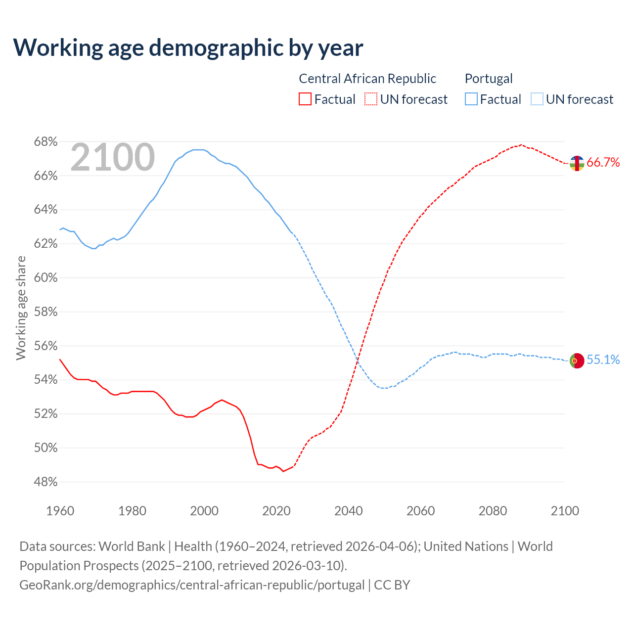 - The Central African Republic has 2.81M working age adults (aged 15-64) vs 6.68M in Portugal.