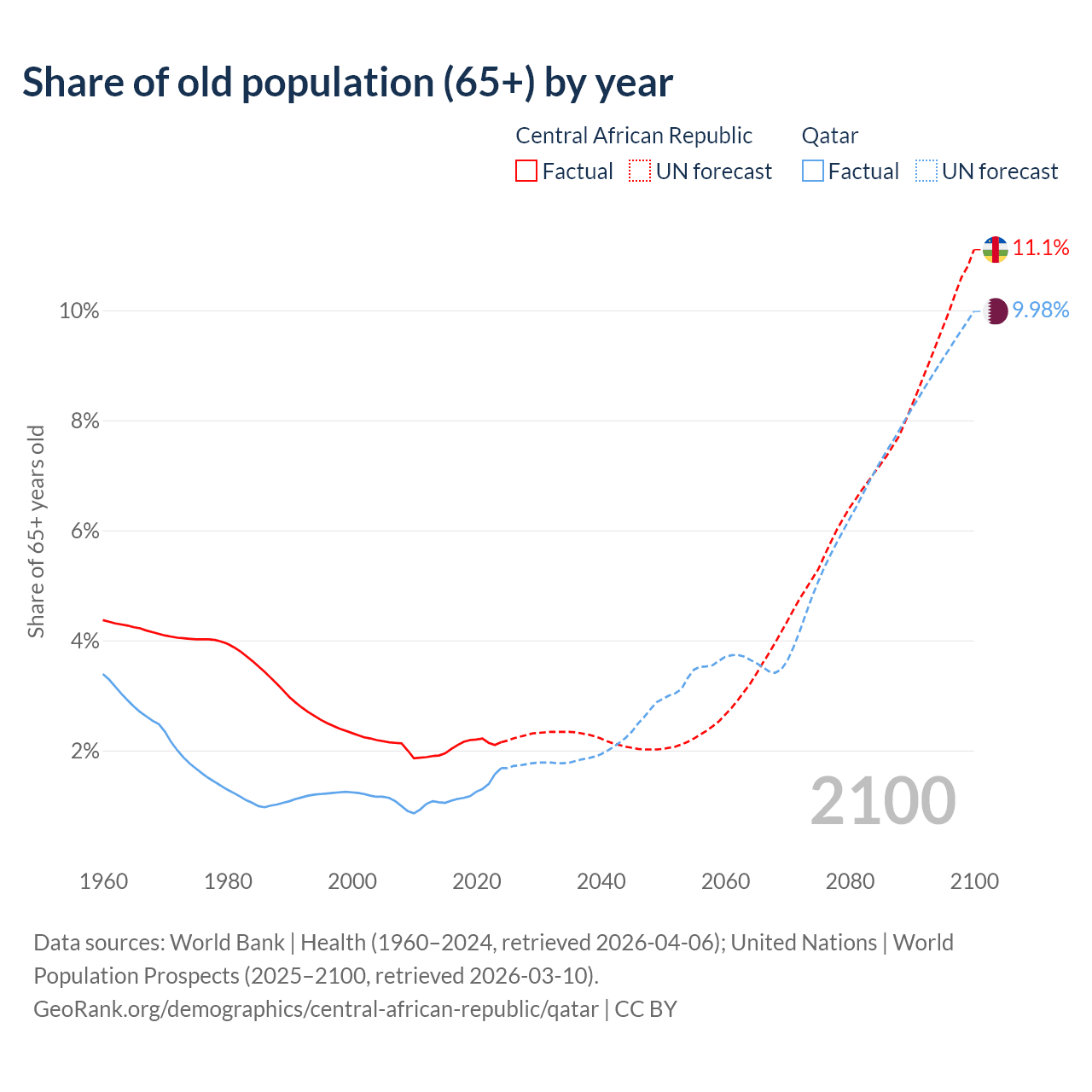 The share of older people aged 65 and over is 2.15% in the Central African Republic and 1.68% in Qatar. Life expectancy in the Central African Republic compared to Qatar .