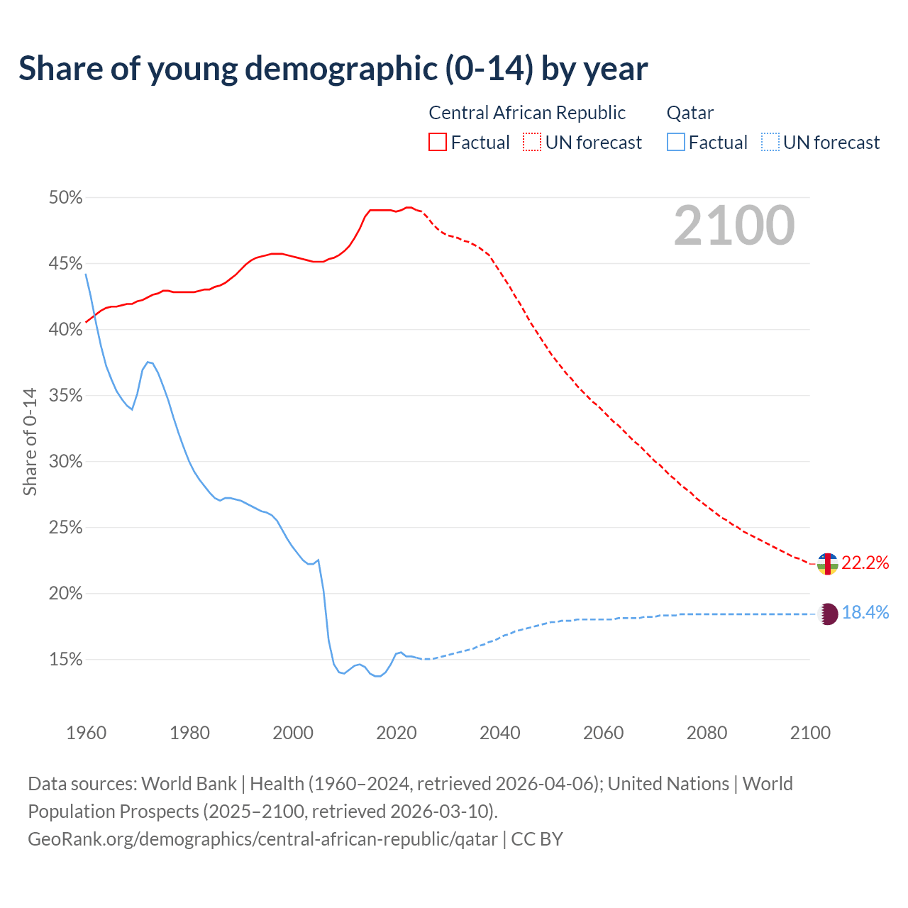 - The share of young demographic (0-15 years old) in the Central African Republic is 49% vs 15.1% in Qatar.