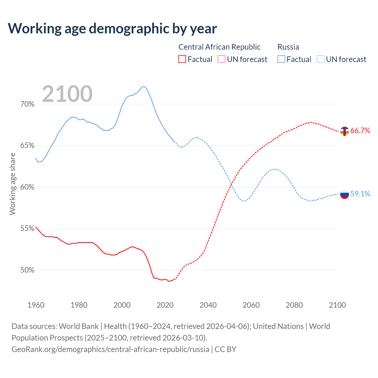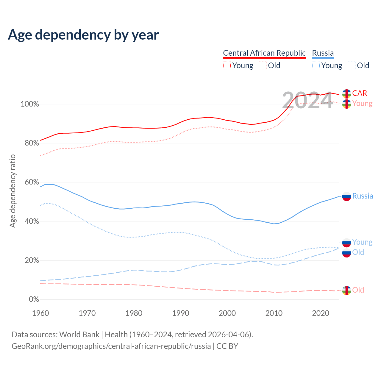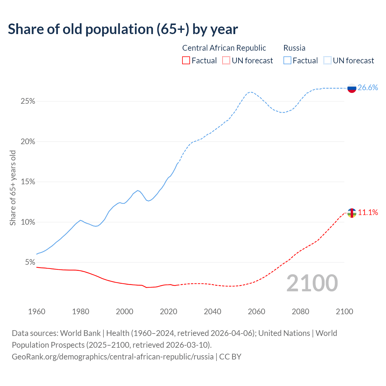 - The share of old-age demographic (65+) in the Central African Republic is 2.15% vs 17.2% in Russia.