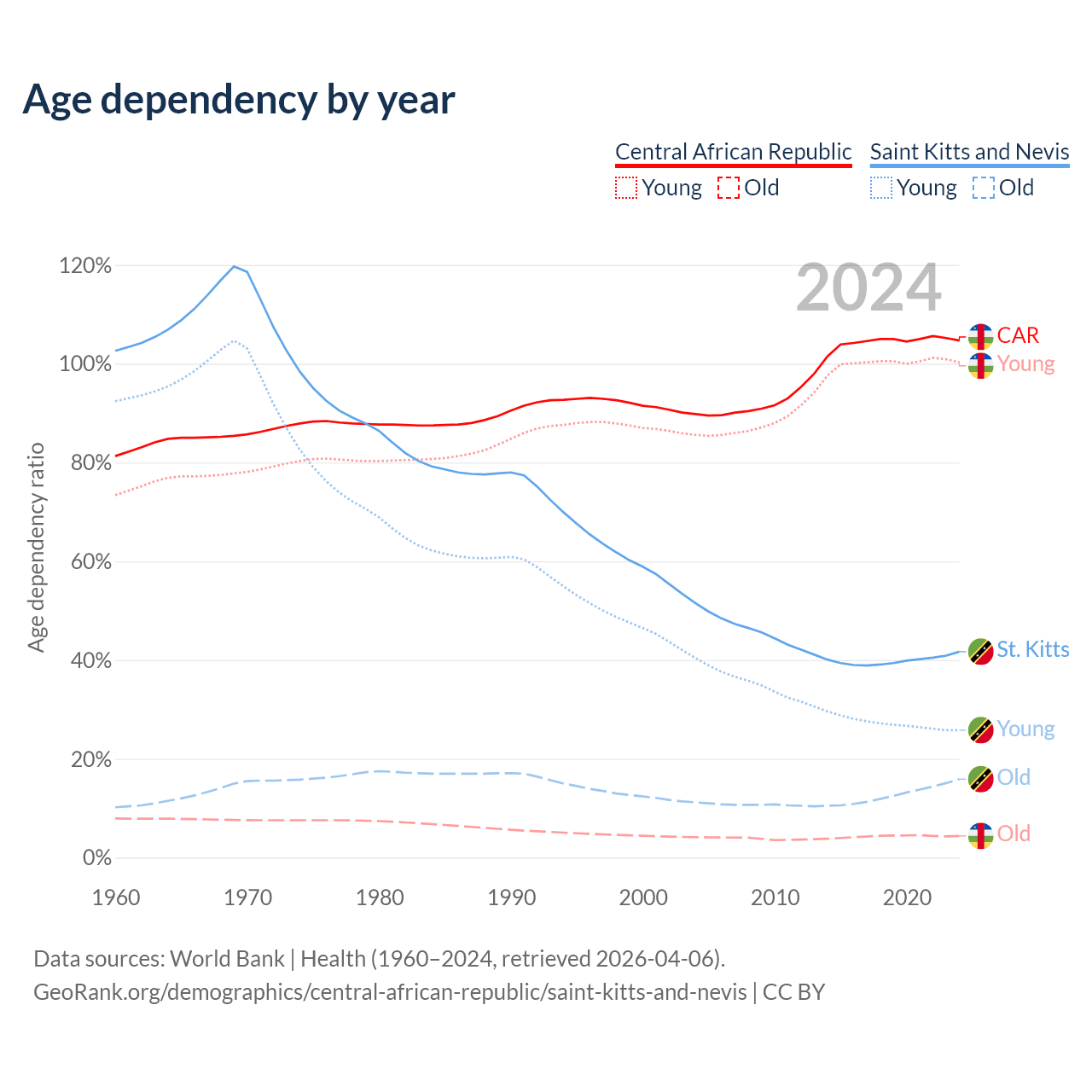 - The share of old-age demographic (65+) in the Central African Republic is 2.15% vs 11.2% in Saint Kitts and Nevis.