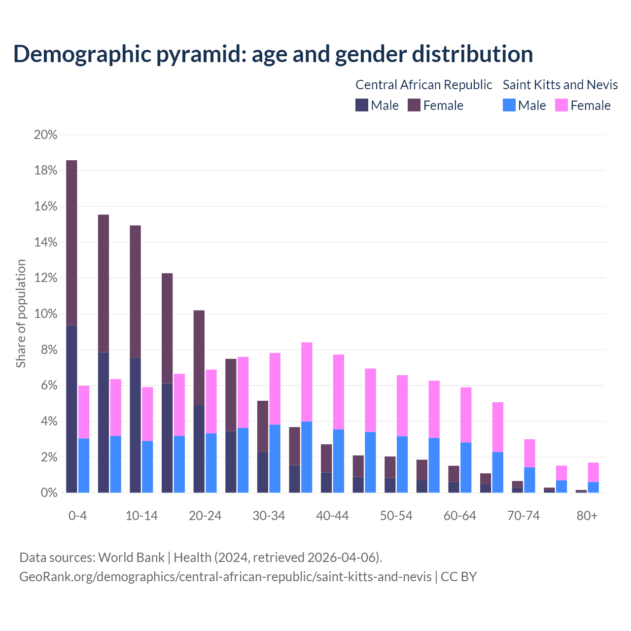 - The Central African Republic is ranked 196/196 by median age (oldest to youngest) vs 69/196 for Saint Kitts and Nevis.