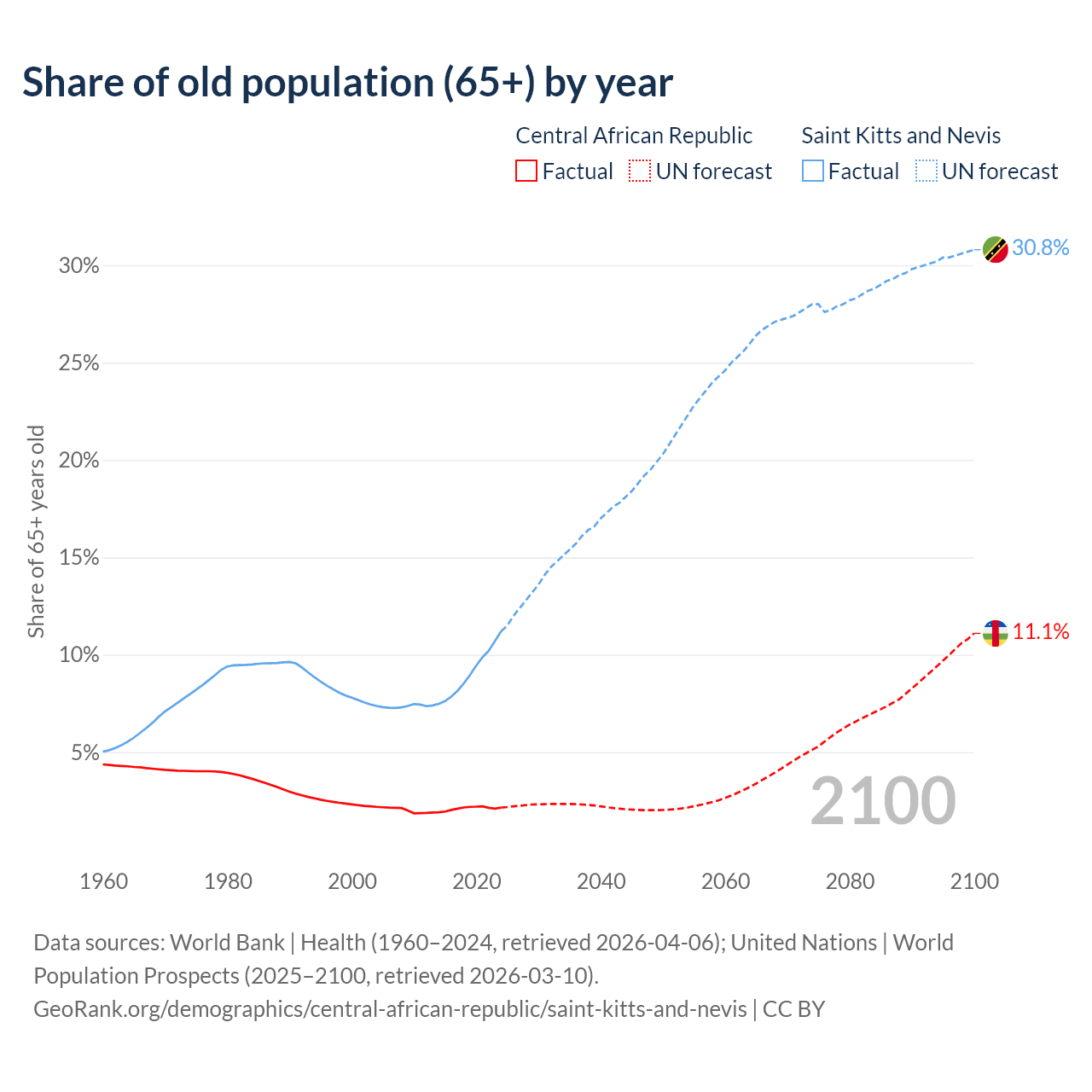 The share of older people aged 65 and over is 2.15% in the Central African Republic and 11.2% in Saint Kitts and Nevis. Life expectancy in the Central African Republic compared to Saint Kitts and Nevis .