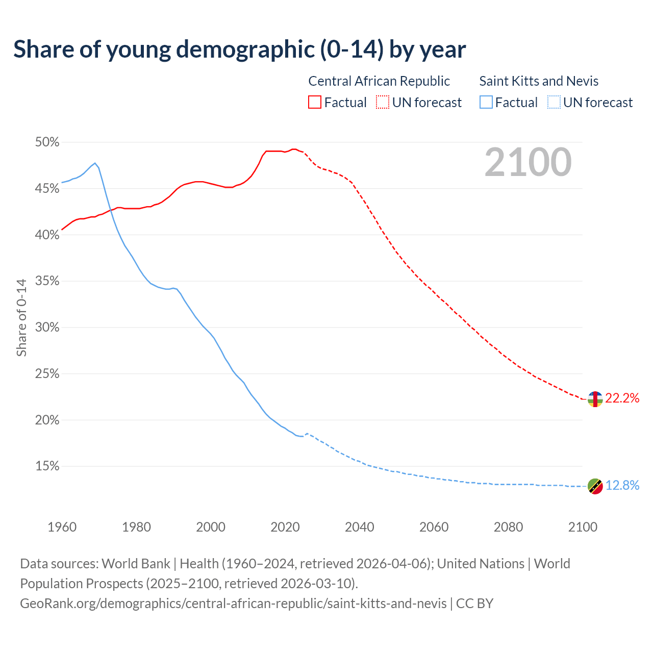 - The share of young demographic (0-15 years old) in the Central African Republic is 49% vs 18.2% in Saint Kitts and Nevis.