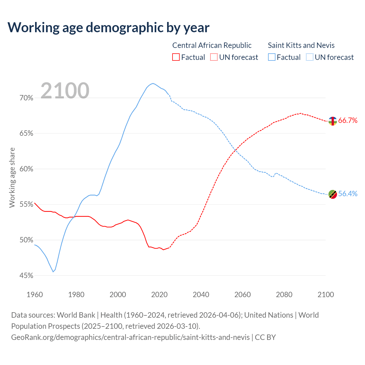 - The Central African Republic has 2.81M working age adults (aged 15-64) vs 33.2K in Saint Kitts and Nevis.