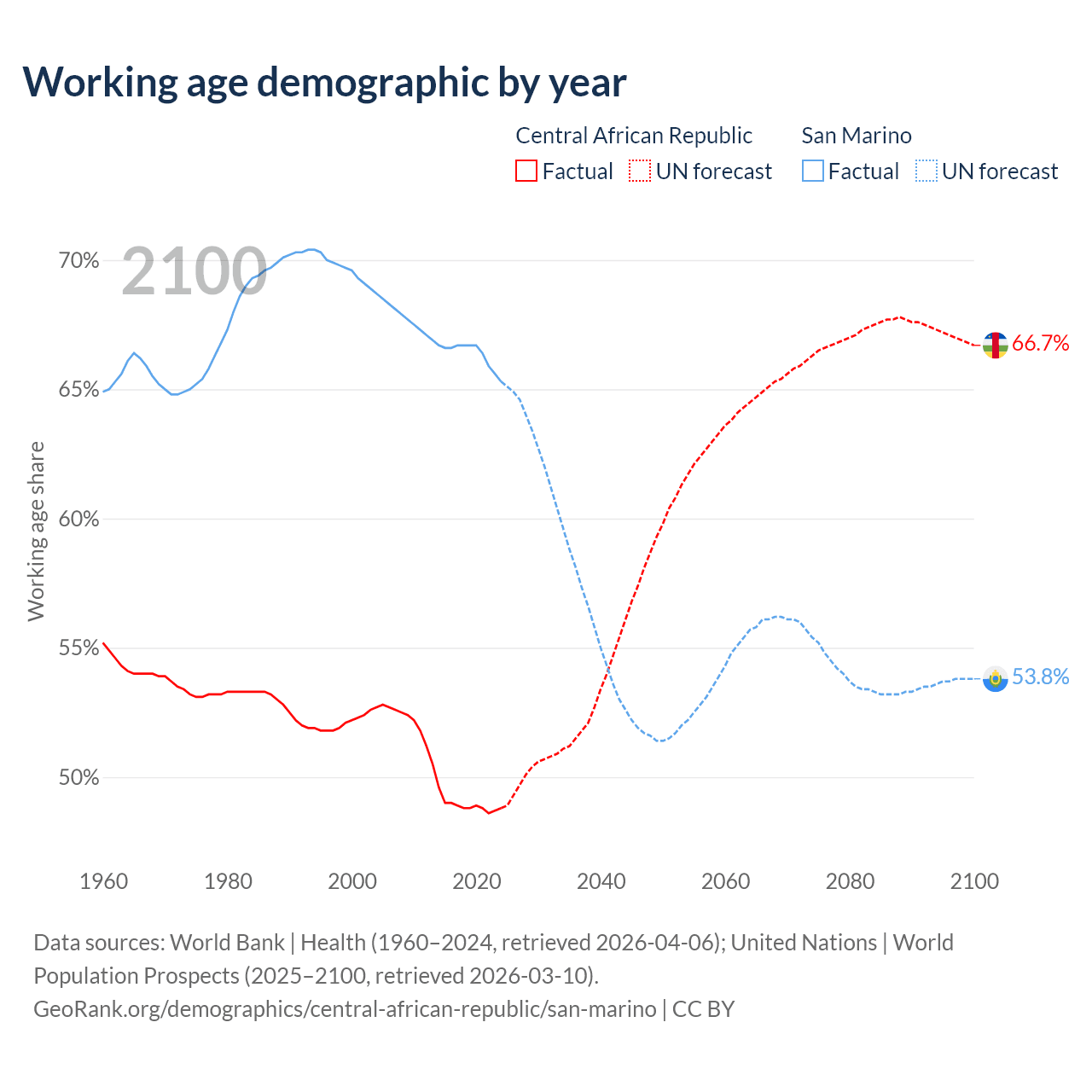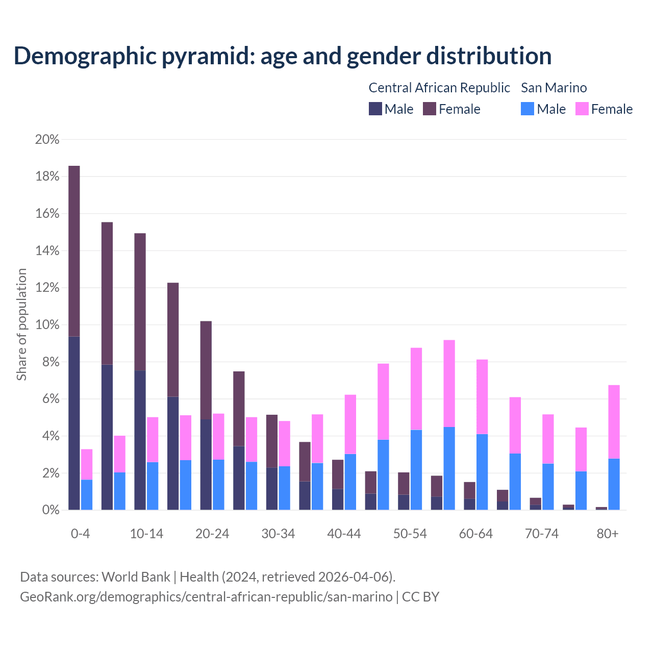 - The share of old-age demographic (65+) in the Central African Republic is 2.15% vs 22.4% in San Marino.