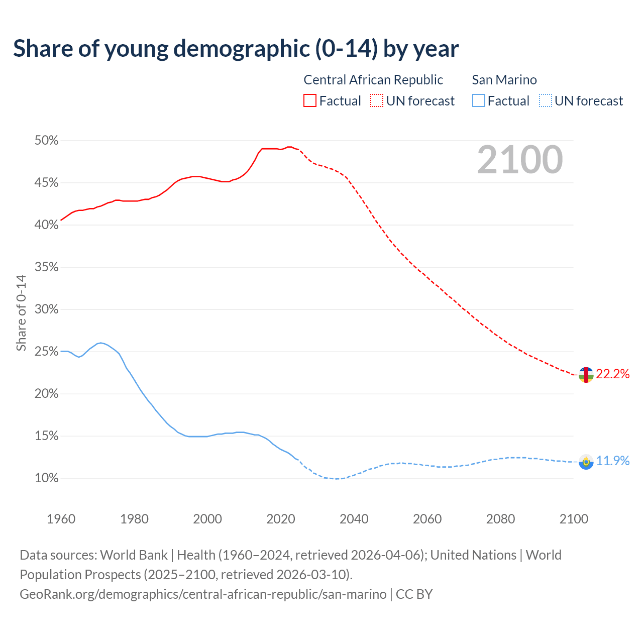 - The share of young demographic (0-15 years old) in the Central African Republic is 49% vs 12.3% in San Marino.