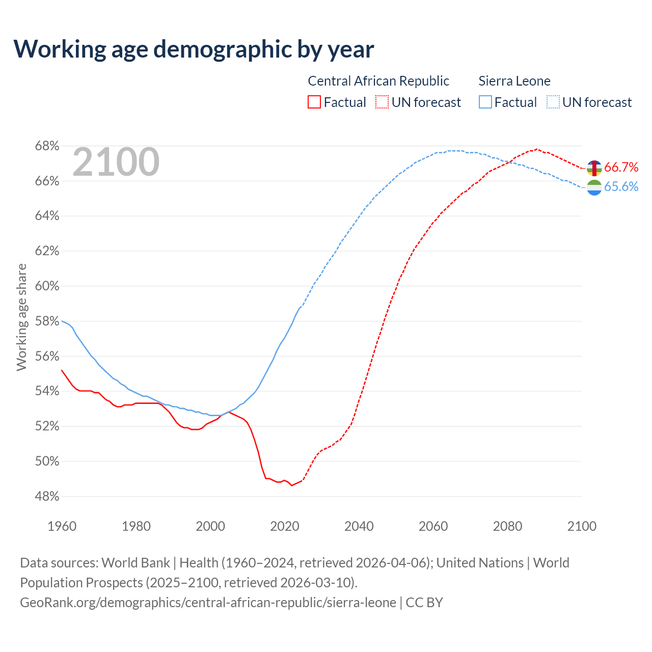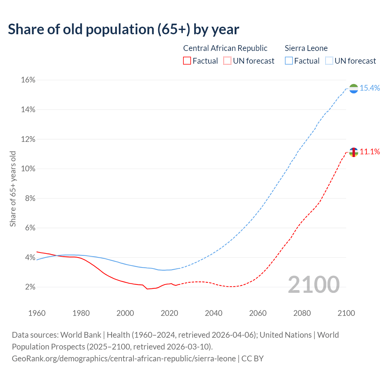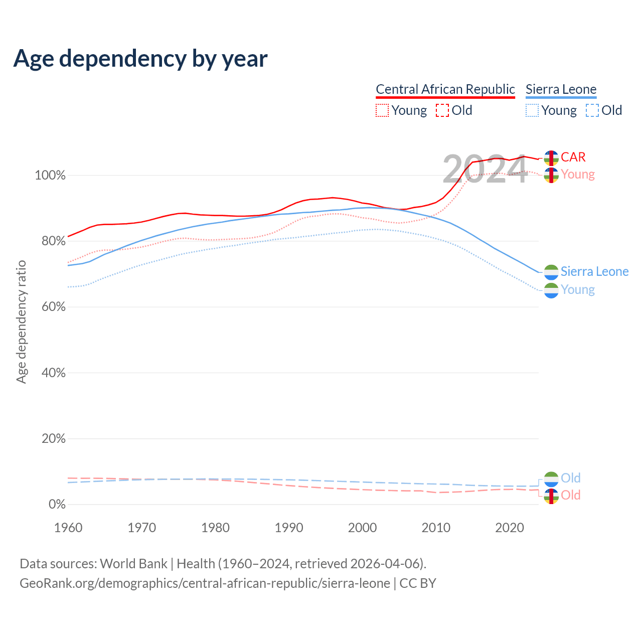 - The share of old-age demographic (65+) in the Central African Republic is 2.15% vs 3.24% in Sierra Leone.
