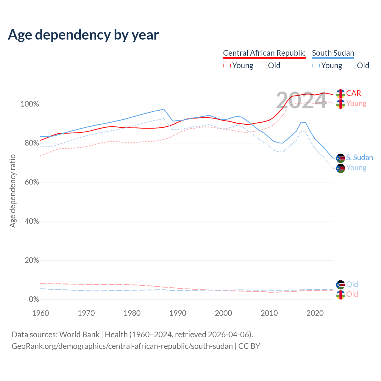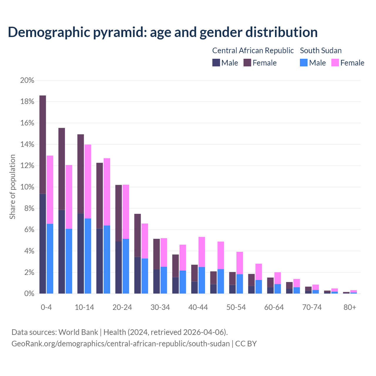 - The Central African Republic is ranked 196/196 by median age (oldest to youngest) vs 173/196 for South Sudan.
